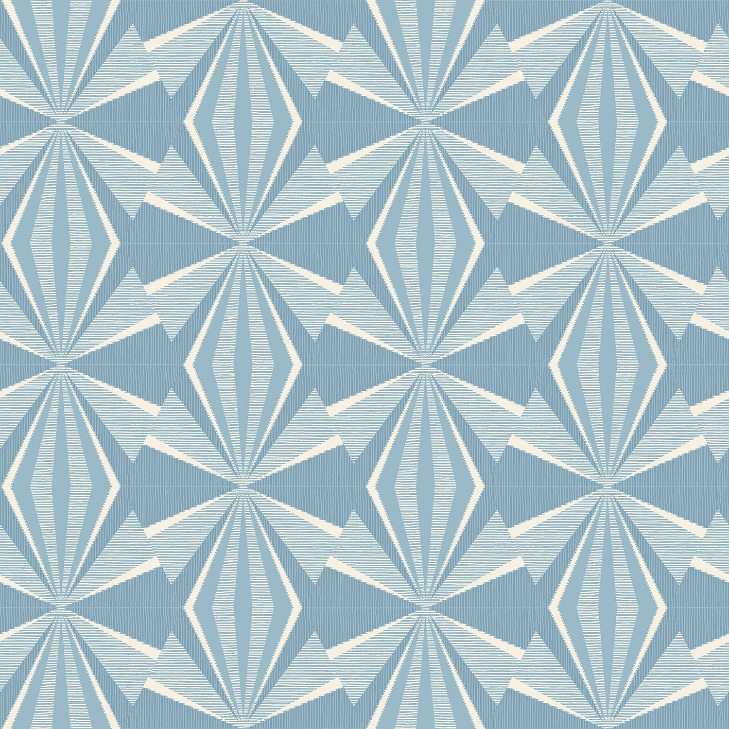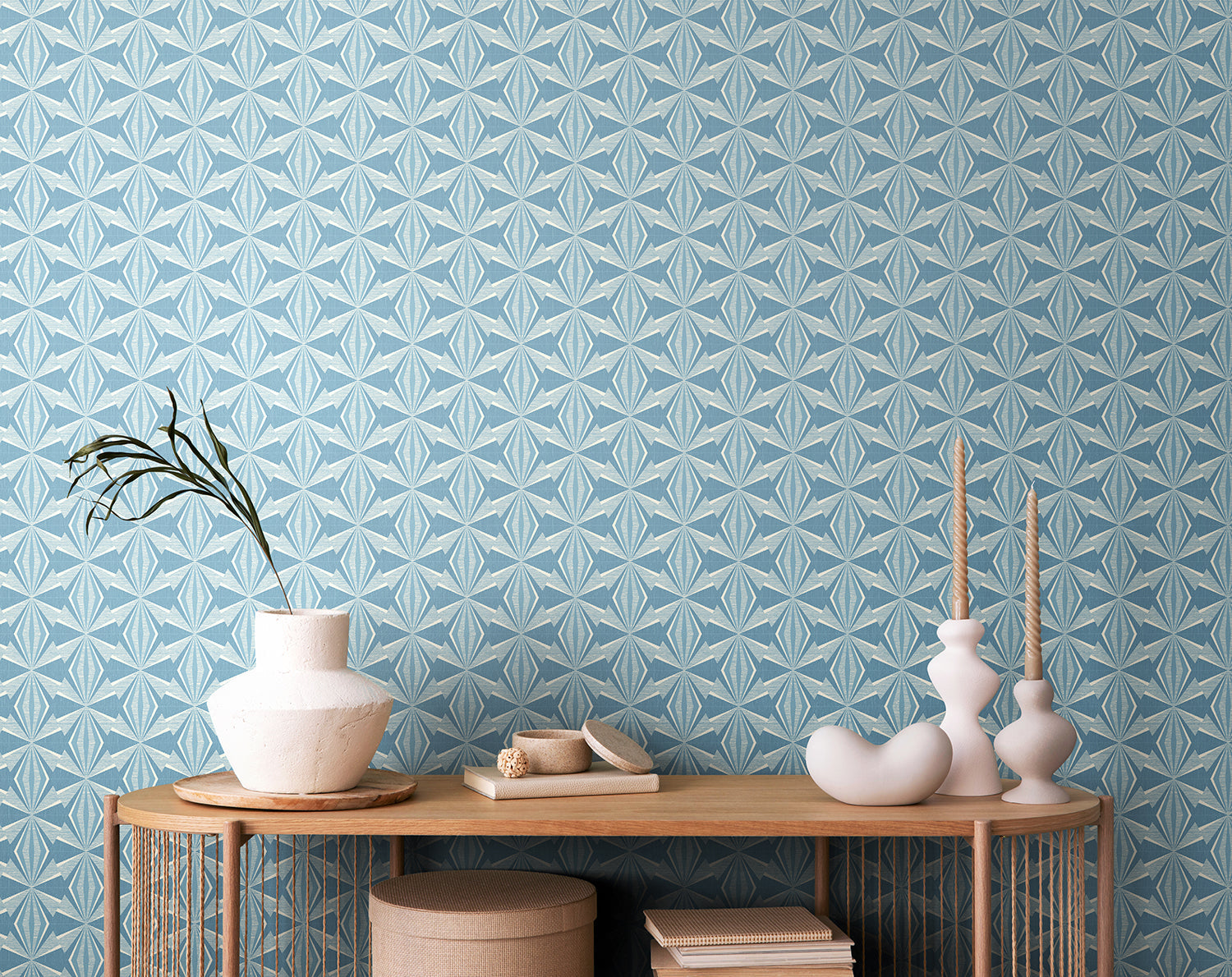 The wallpaper presents a captivating image featuring a sequence of interlocking diamonds in striking blue tones. The design creates a hypnotic display on the wall, as if the sun’s rays are shining through precious geometric prisms. The repeating pattern evokes the sensation of a contemporary optical illusion, guaranteed to transform living spaces with its radiant and elegant appearance. This mesmerising feature will enhance hallways, lounges, and bedrooms alike, bringing a distinctive personality to your home decor.
