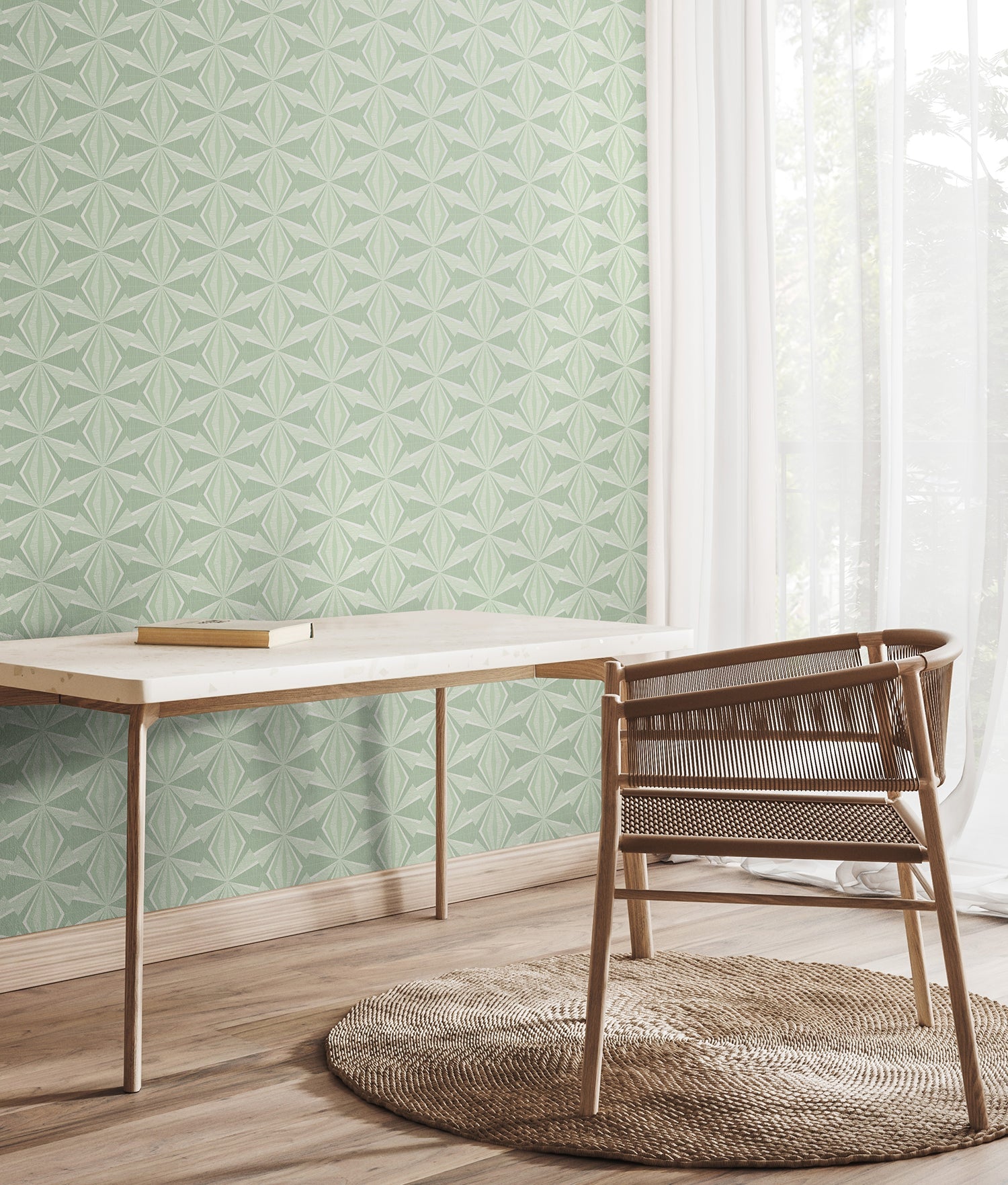 The Hoopla Walls Sunray Diamond Mint Green wallpaper is a refined and high-quality creation from a well-known brand, celebrated for its innovative designs and premium craftsmanship. This designer wallpaper stands out as an impressive choice for customers seeking both style and substance, with a reputation for modern elegance and lasting quality.