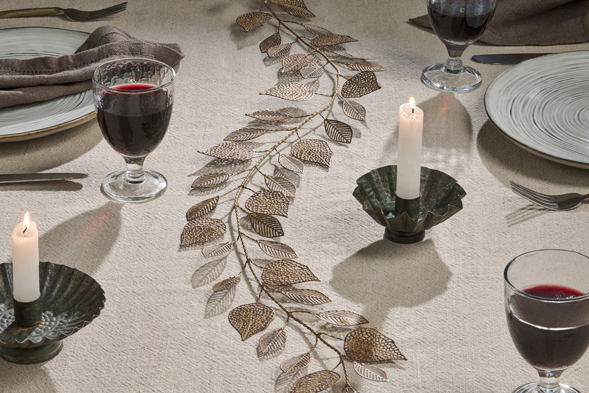 This exquisite garland features a captivating array of intricate filigree leaves in a muted, antique brass finish. Each leaf catches the light delicately, evoking the serenity and beauty of nature. Whether draped across a mantelpiece, woven through a staircase, or arranged as a striking seasonal table centrepiece, the garland adds a refined, festive touch to any setting.
