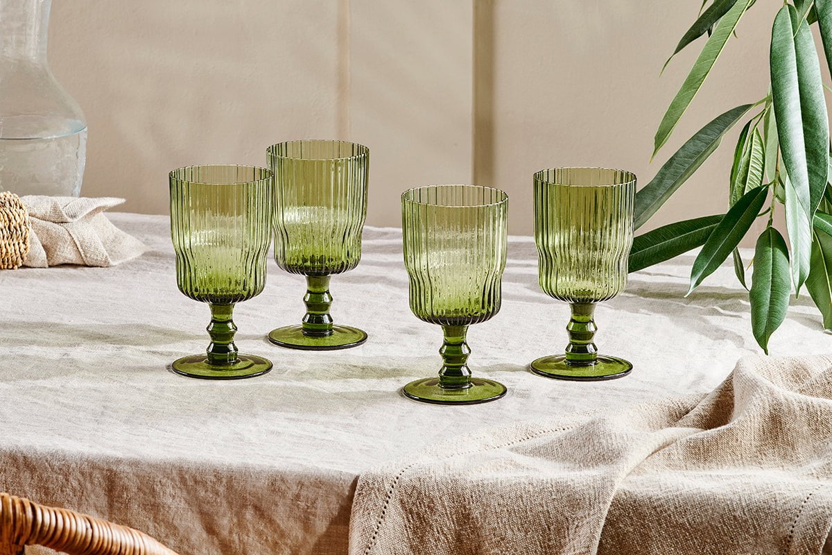 The Nkuku Fali Wine Glass Olive (Set Of 4) showcases Nkuku's unique approach to glassware, combining the attractive olive green tone with a practical, versatile silhouette. Whether displayed on a festive table or used during casual gatherings, these glasses invite both everyday use and special occasions.