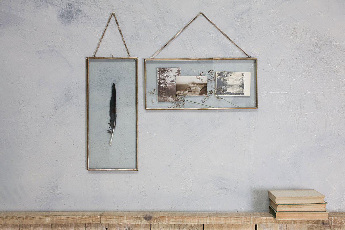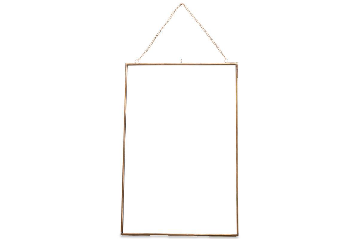 The image portrays a striking frame in an exquisite antique brass finish, its wide borders outlined with a distinctive metallic gleam. The frame is elegantly suspended by a coordinating brass chain, adding both visual interest and a sense of refined charm. With clean lines and a minimalist silhouette, this photo frame naturally draws attention to your treasured photographs or memories, enhancing their prominence within any setting.