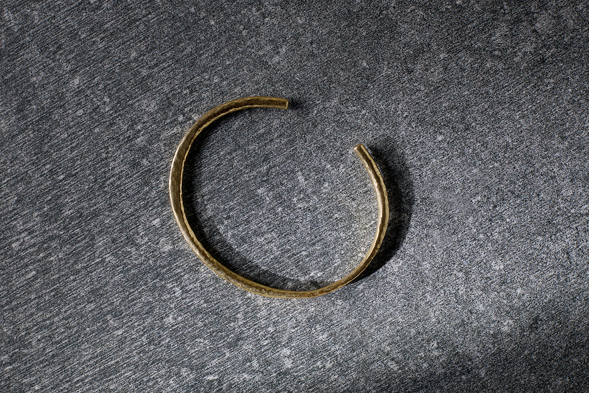 The image reflects an elegantly minimal gold bracelet with a naturally contoured form, gently curving in a way that feels both organic and deliberately refined. Its lustrous finish adds a warm, inviting glow, and the subtle, tactile nature of its design ensures it stands out whether worn alone or stacked with other favourites.