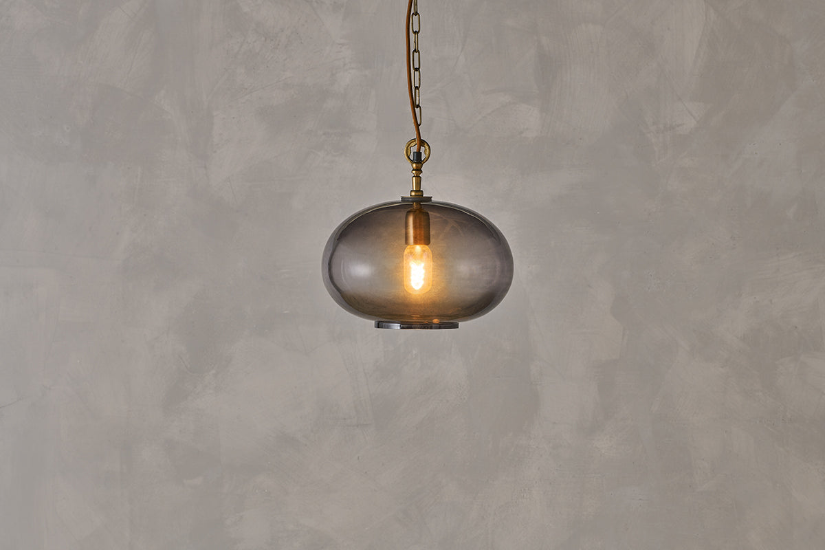 - Striking, hand-blown smoke glass shade for a unique finish