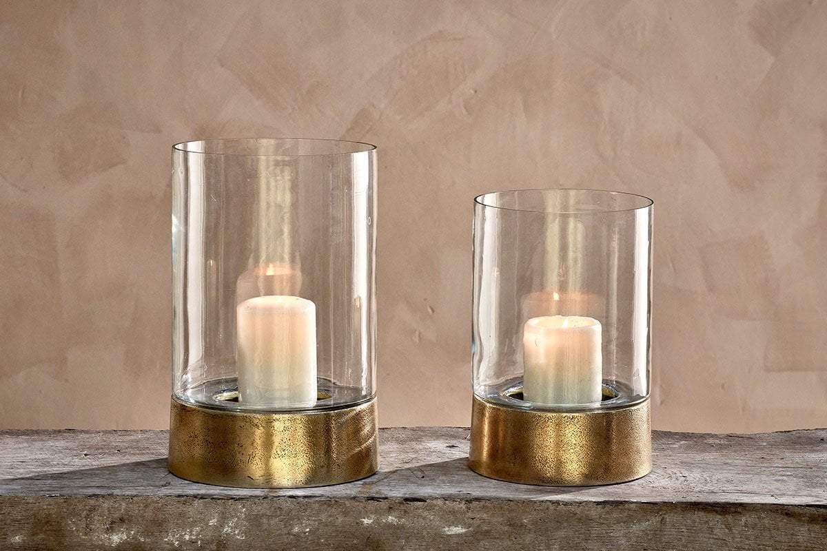 In the image, you’ll notice the hurricane lantern’s elegant silhouette, with sleek, transparent glass that rises gracefully from a striking, deeply toned brass-coloured base. The base displays appealing character through its textured, gently weathered finish, lending an artisan feel. The rich golden hue catches the light, casting a soft, inviting glow that enhances both contemporary and rustic interiors alike.