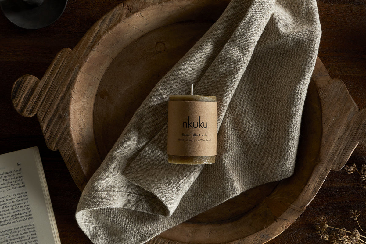The Nkuku Rustic Soy Blend Mini Pillar Candle Olive is brought to you by Nkuku, a well-known brand recognised for their distinctive, artisan-inspired designs and exceptional quality. Celebrated for their commitment to ethical craft and timeless style, Nkuku ensures each piece adds character and warmth to the home.
