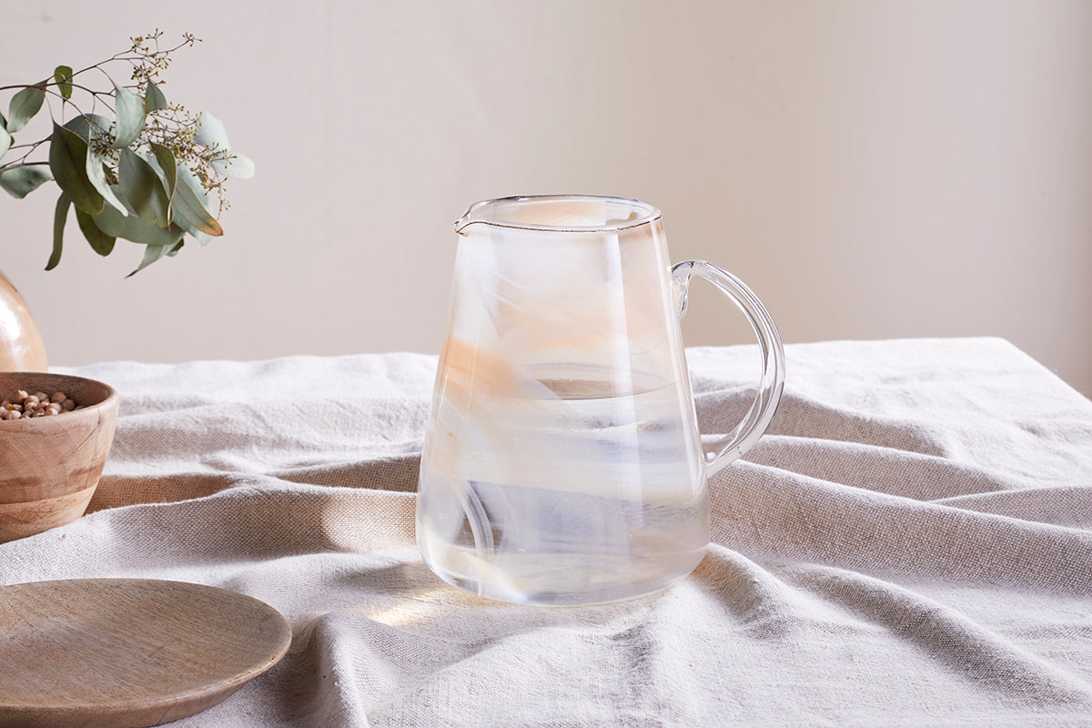 The image presents a striking jug, effortlessly combining modern design with artisan allure. Its surface glows with an ethereal apricot hue, swirling delicately through sheer glass that catches the light beautifully. The distinctive marble effect pattern adds visual interest, while the curvaceous base flows seamlessly into a gracefully arched handle, making it as stylish as it is functional.