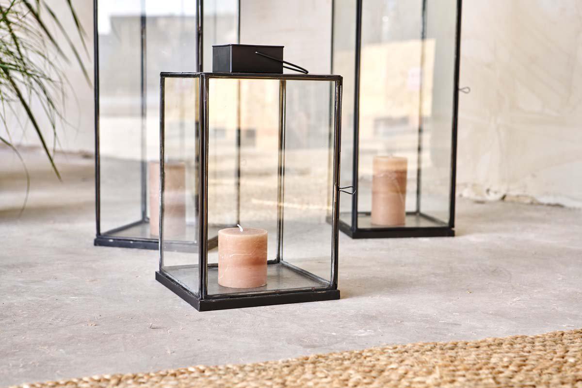 This lantern boasts a sleek, geometric structure with beautifully clear glass panels encased in a bold, dark frame. The eye-catching silhouette creates a mesmerising interplay of light and shadow, making it a captivating feature whether placed indoors or out. Its elegant yet understated design blends seamlessly with both modern and classic décors, providing a warm and inviting glow.