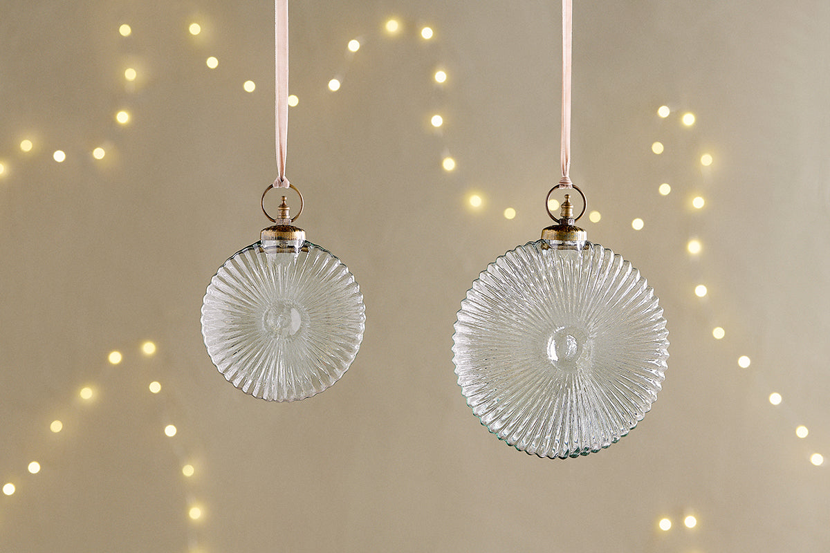 The Nkuku Sundara Giant Bauble Clear is visually captivating, featuring a mesmerising disc-like shape reminiscent of nature’s treasures. With its transparent surface, the bauble beautifully reflects light, creating an enchanting effect amidst your festive arrangements. The antique-style clasp and elegant velvet ribbon add a touch of refined charm, while the delicate, fossil-inspired detailing makes this bauble truly unique among Christmas decorations.