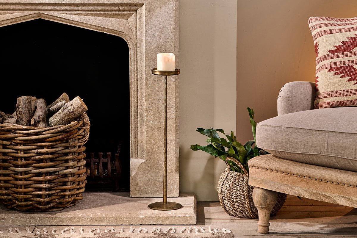 The Nkuku Sundra Iron Candle Stand is an elegant creation, designed to make a statement wherever you choose to place it. The tall, slender silhouette gives it a delicate appearance, but every inch has been expertly forged, resulting in a robust yet sophisticated accessory. The distinctive antique brass effect, achieved during skilled soldering, lends the piece a timeless appeal and makes it an ideal candle holder for pillar candles, whether styled beside a hearth or as a centrepiece on a mantel.