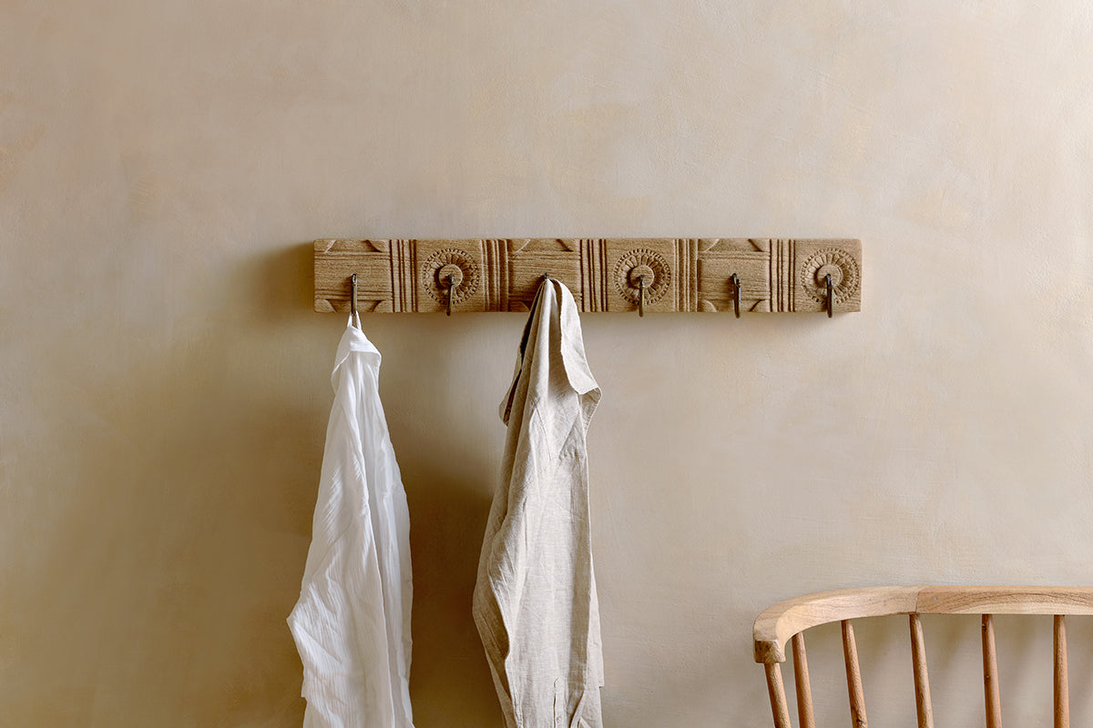 The Nkuku Veduru Mango Wood Carved Hook Natural (Row Of 6) combines practicality with decorative appeal, serving as a versatile storage solution for busy households. Featuring delicate carving, every hook is distinct, reflecting the care and expertise invested in its creation. Whether you are seeking to organise coats or display decorative accessories, this piece provides functional elegance.