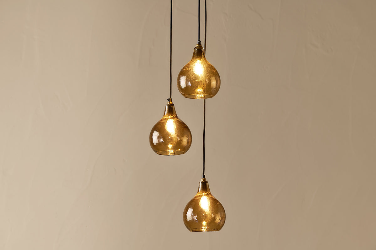 The image showcases a sophisticated cluster pendant light, featuring three elegant, smoke brown glass shades, each skilfully shaped to create a harmonious yet eye-catching formation. The subtle antiqued brass ceiling rose complements the muted tones of the recycled glass, bringing warmth and depth to the overall aesthetic. Delicate, adjustable cords allow the shades to hang at varying heights, ensuring a dynamic and bespoke visual effect to suit your space.