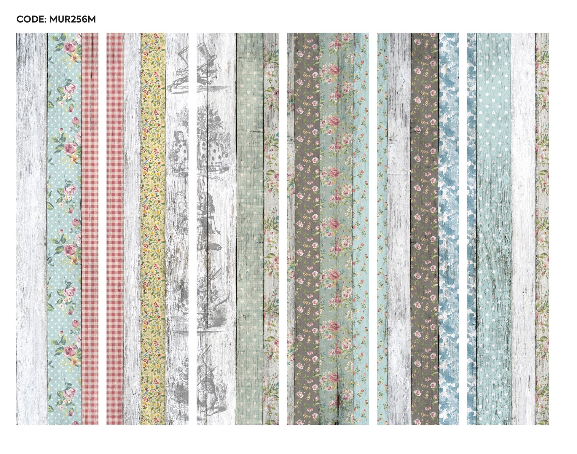The image captures a delightful blend of small-scale florals and classic picnic blanket-inspired checks, artfully layered over a wood-effect background. The soft, earthy hues and vintage-inspired patterns conjure feelings of countryside picnics and rustic cottages, infusing the scene with the unmistakable charm of the English countryside. The overall effect is both whimsical and soothing, making this design a highlight for lovers of cottagecore aesthetics.