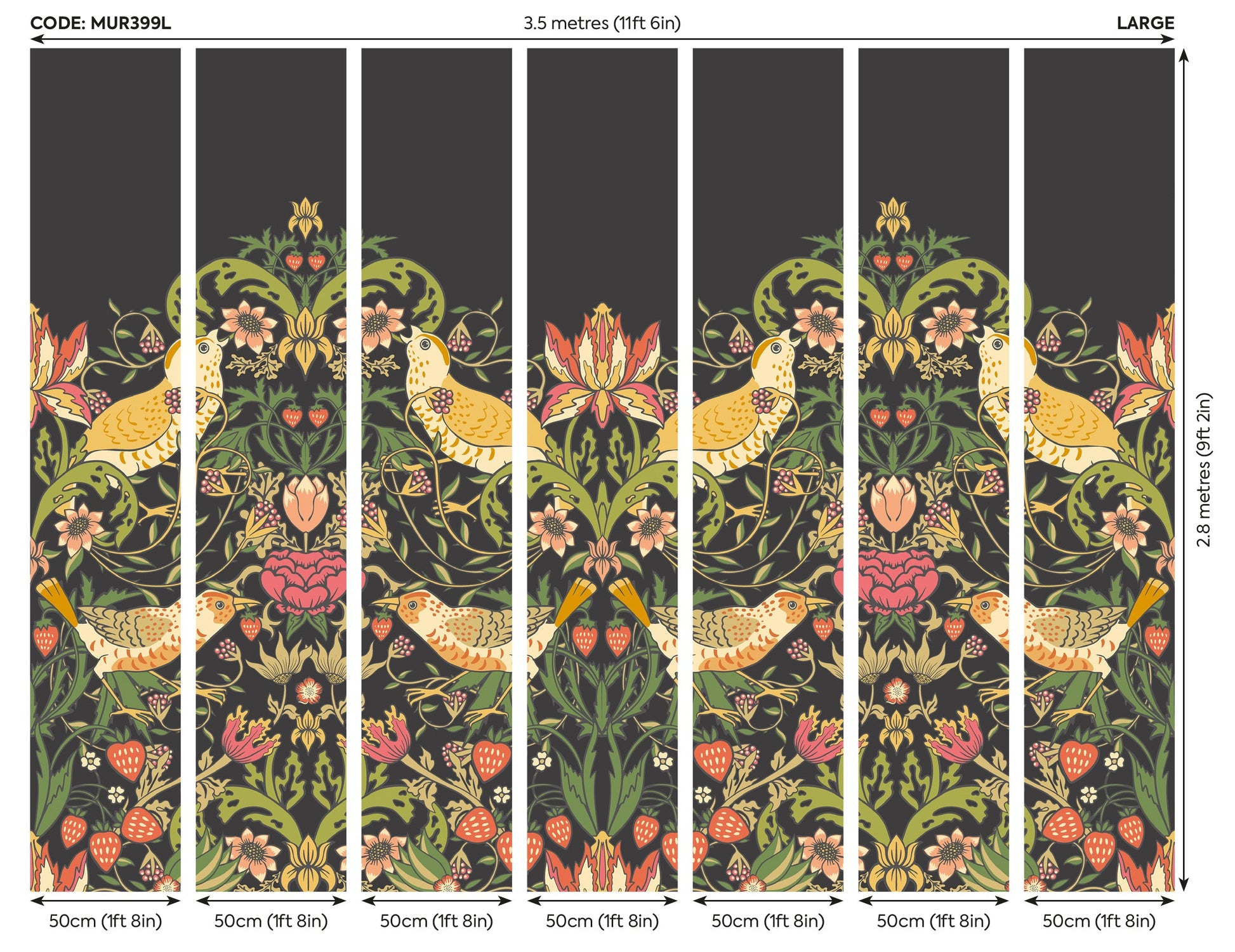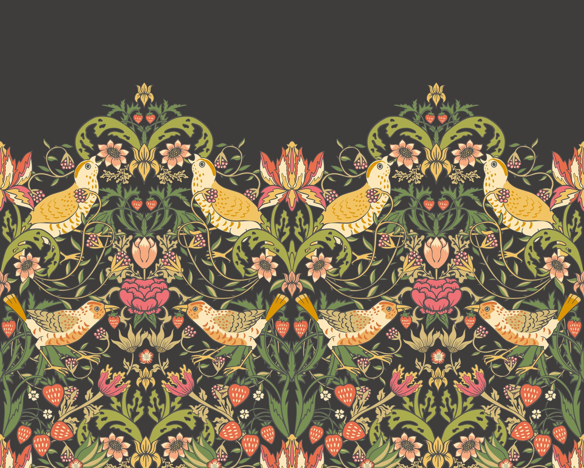 The Origin Murals Birds Fruit And Foliage Black And Olive wallpaper epitomises timeless elegance, with its repeating pattern inspired by the iconic 1883 William Morris design. The backdrop of deep black and olive hues enhances the playful yet sophisticated arrangement of birds and botanical elements, making this mural a perfect choice for feature walls or larger spaces seeking a blend of heritage and contemporary charm.