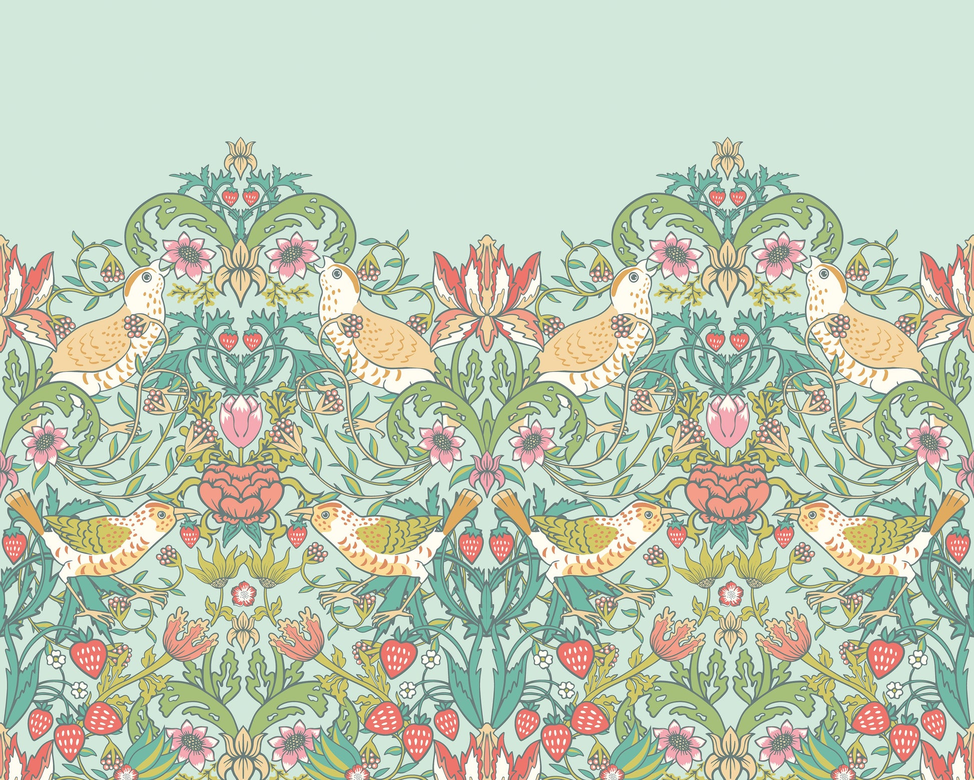 The mural presents a captivating scene: mischievous thrushes are caught in the act of stealing ripe fruit and picking berries, while grand, sweeping flowers and lush foliage encircle the birds in a lively display. The artistry of the wallpaper is truly striking, with a harmonious palette of duck egg tones and intricate detail that draws inspiration from celebrated nineteenth-century British design. The overall image evokes a sense of movement, charm, and gentle nostalgia that enhances any room.
