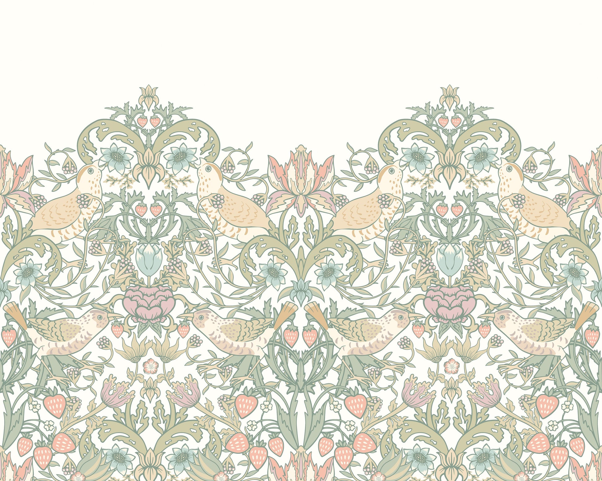This mural features a captivating scene: lively thrushes dart cheekily between lush greenery, caught in the act of plucking ripe fruit and delicate berries. Ornamental flowers wind elegantly around the birds, creating a rich tapestry of wildlife and foliage. The sage and apricot hues evoke a sense of serenity and warmth, beautifully complementing contemporary and heritage interiors alike.
