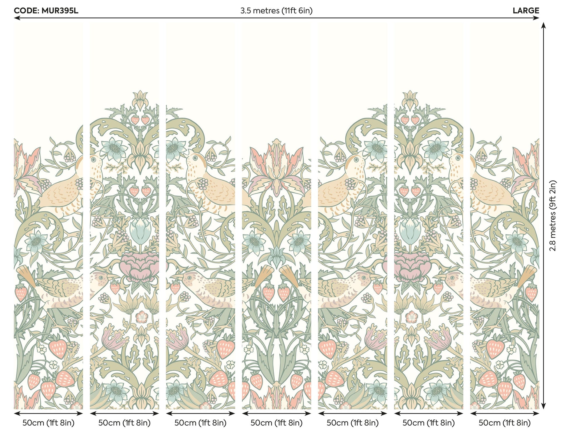 The Origin Murals Birds Fruit And Foliage Sage And Apricot mural is a stunning wallpaper, perfectly capturing the detail and storytelling of the original 1883 William Morris design. Sweeping botanicals frame charming avian figures, infusing any space with a lively yet refined atmosphere. This mural makes an impressive focal point, transforming your chosen room with its enchanting, repeating motif.