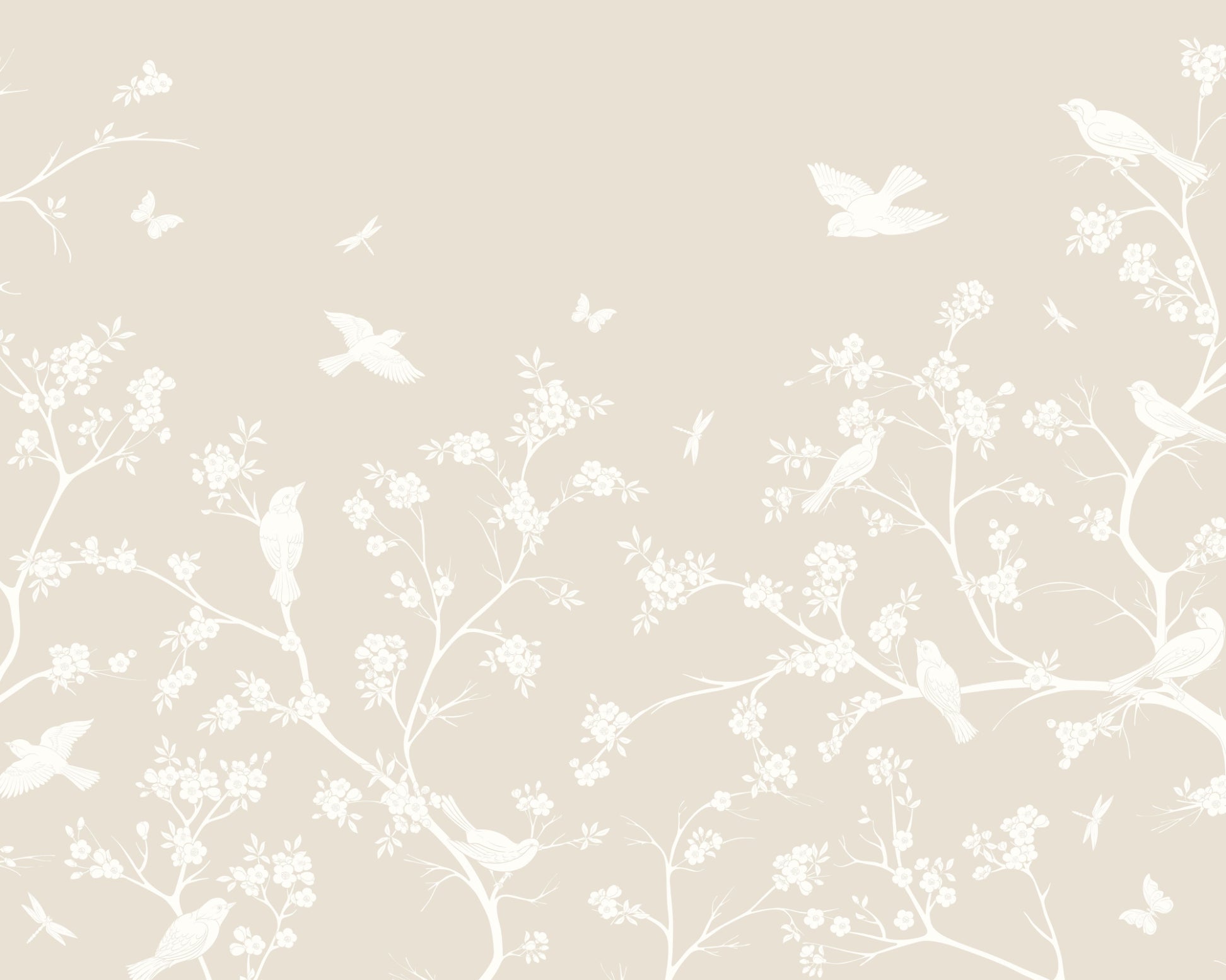 The mural presents a tranquil scene where branches stretch elegantly across a gentle, natural stone background. Delicately outlined birds and butterflies flutter amidst blossoms in a graceful arrangement, evoking the peaceful ambience of an English country garden. Subtle silhouettes and intricate linework provide a harmonious balance of simplicity and refinement, creating an uplifting atmosphere in any space.