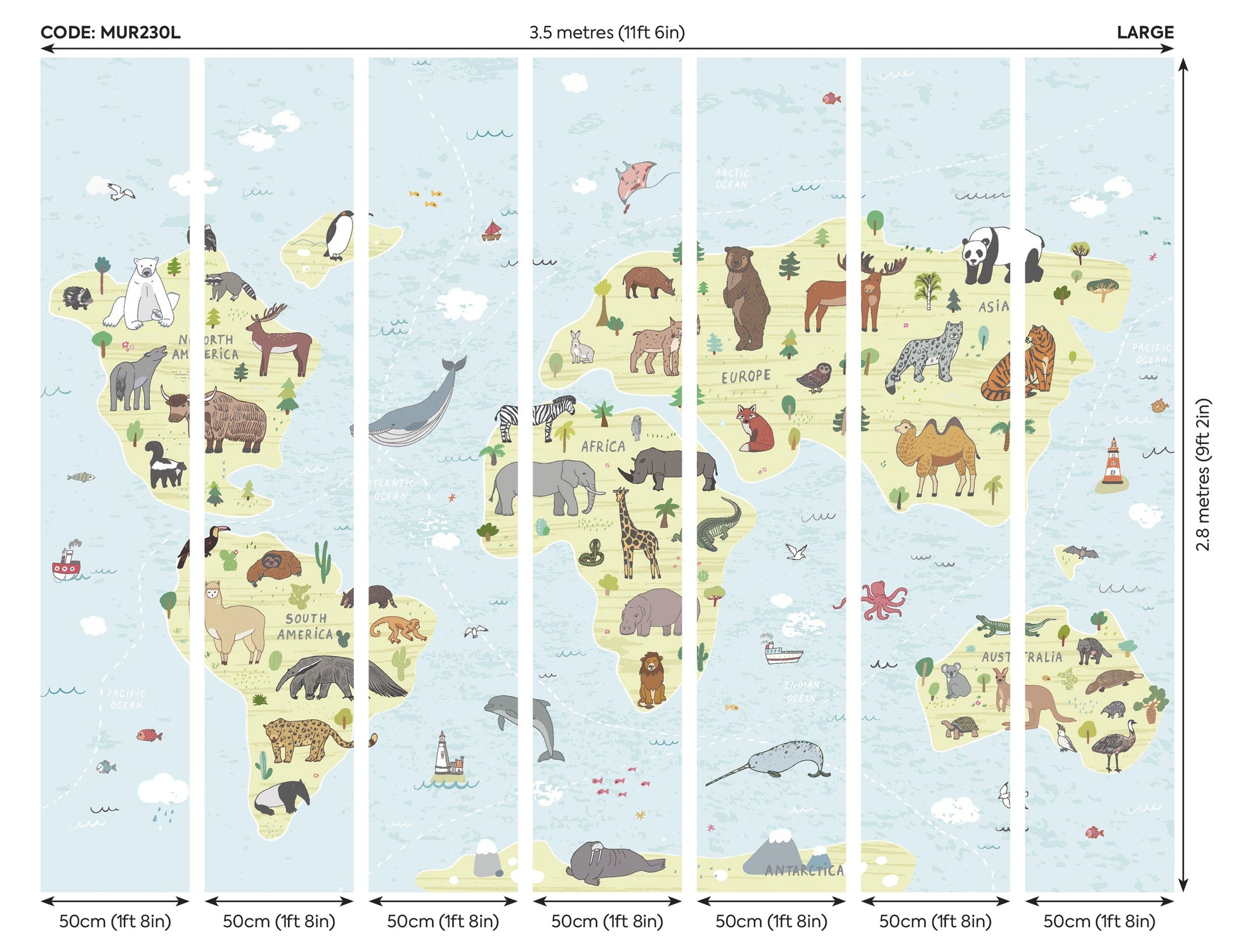 The Origin Murals Childrens World Map Blue 350cm X 280cm wallpaper is designed to both educate and enchant. This captivating mural brings learning into your home, providing children with a visual exploration of the world and its fascinating wildlife, all in soothing blue tones that make the room feel calm and welcoming.