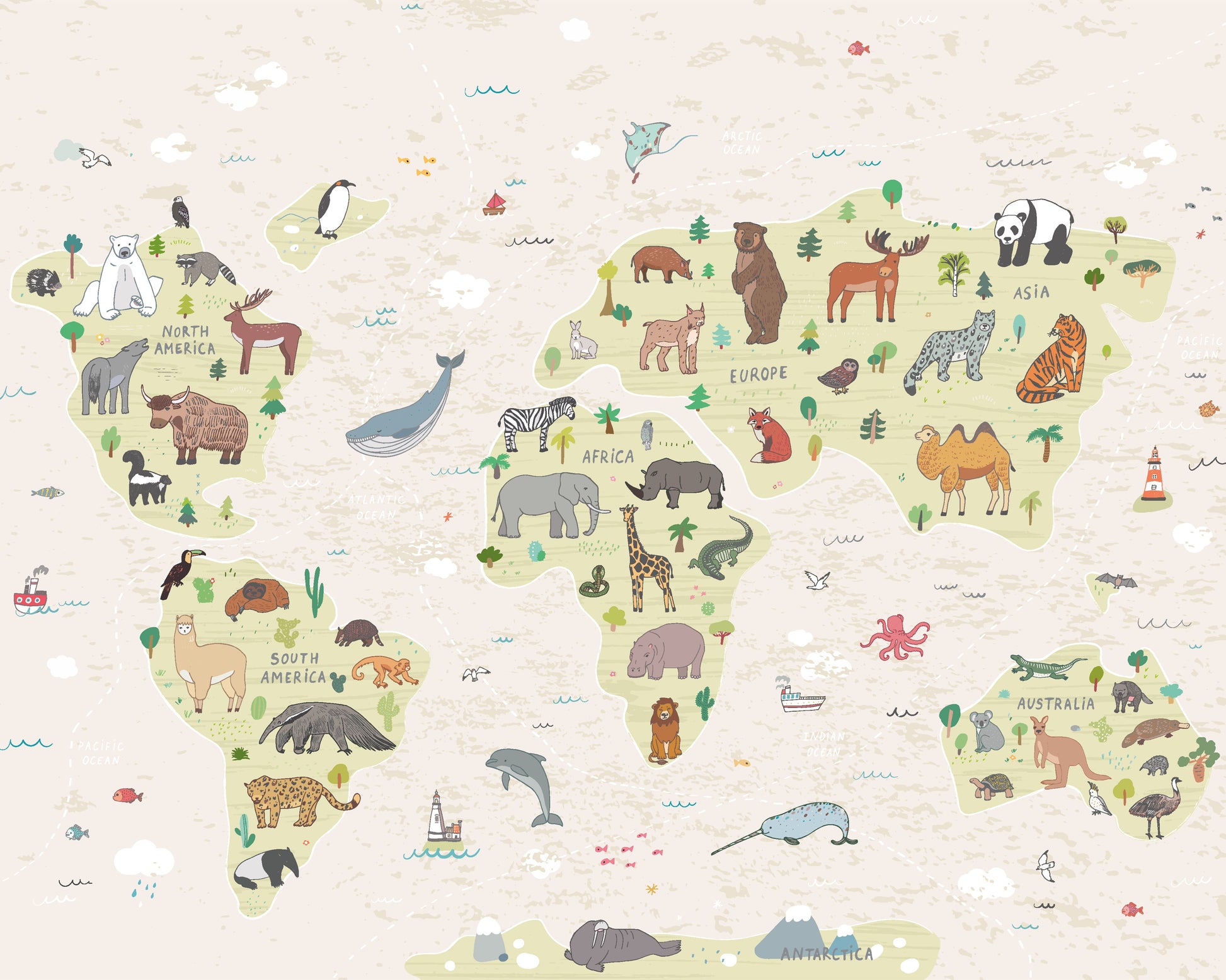 Designed to ignite curiosity, the Origin Murals Children's World Map Natural combines creative charm with purposeful education. The mural portrays animals from across the continents in delightful form, offering opportunities for children to explore the world's wildlife without ever leaving home. Little boats and subtle natural details across the map not only enhance the decorative appeal but also provide endless points of discovery.