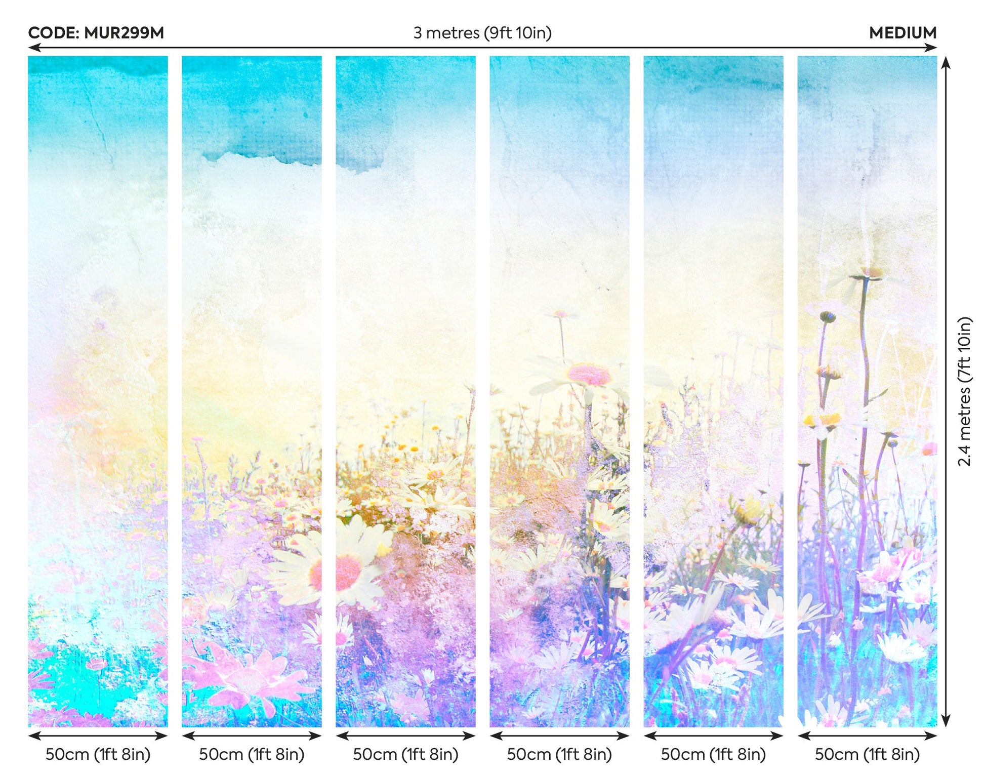 From the esteemed Origin Murals, renowned for their impeccable craftsmanship and high-quality wall coverings, comes a breath-taking addition to home interiors. The wallpaper reveals a harmonious blend of soft, gentle colours that wash across the scene. The image features gracefully arching stems stretching upward, dotted with delicate, blooming florals in pastel shades set against a subtle purple background, creating a tranquil meadow vista.