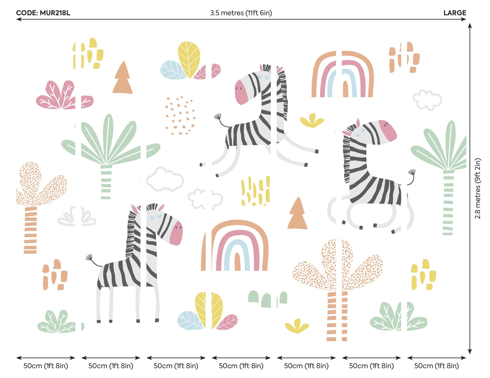 The whimsical scene features a parade of playful zebras dancing enthusiastically across a chic, cloud-white backdrop. Artful illustrations of palm trees, gentle rainbows, soft clouds, and lush leaves bring layers of joy and creativity to the display, infusing the room with subtle movement and a sense of wonder. The overall effect is a delightful balance of fun and stylish sophistication—perfect for sparking imagination in children and adults alike.