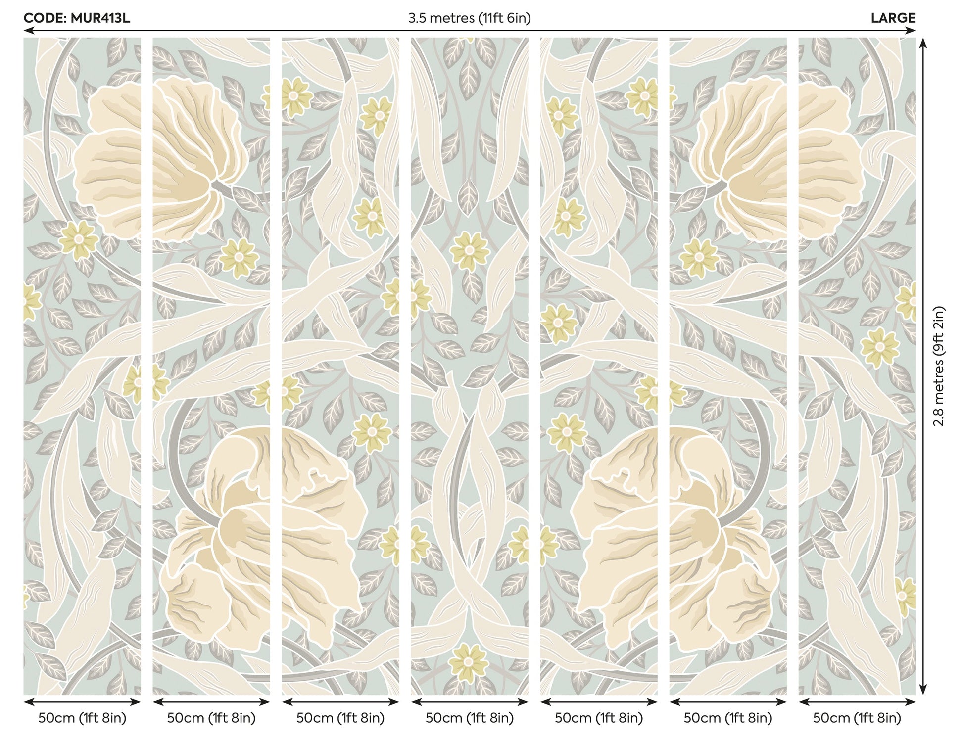 The artwork displayed on this mural captivatingly brings to life an abundant array of large, blossoming flowers, arranged meticulously in mirrored figure-of-eight formations. Graceful, swirling vines weave through the mural, their intricate curves creating a dynamic sense of movement and drama. The colour palette draws from muted duck egg and subtle linen shades, contributing an atmospheric serenity and elegance to any setting.