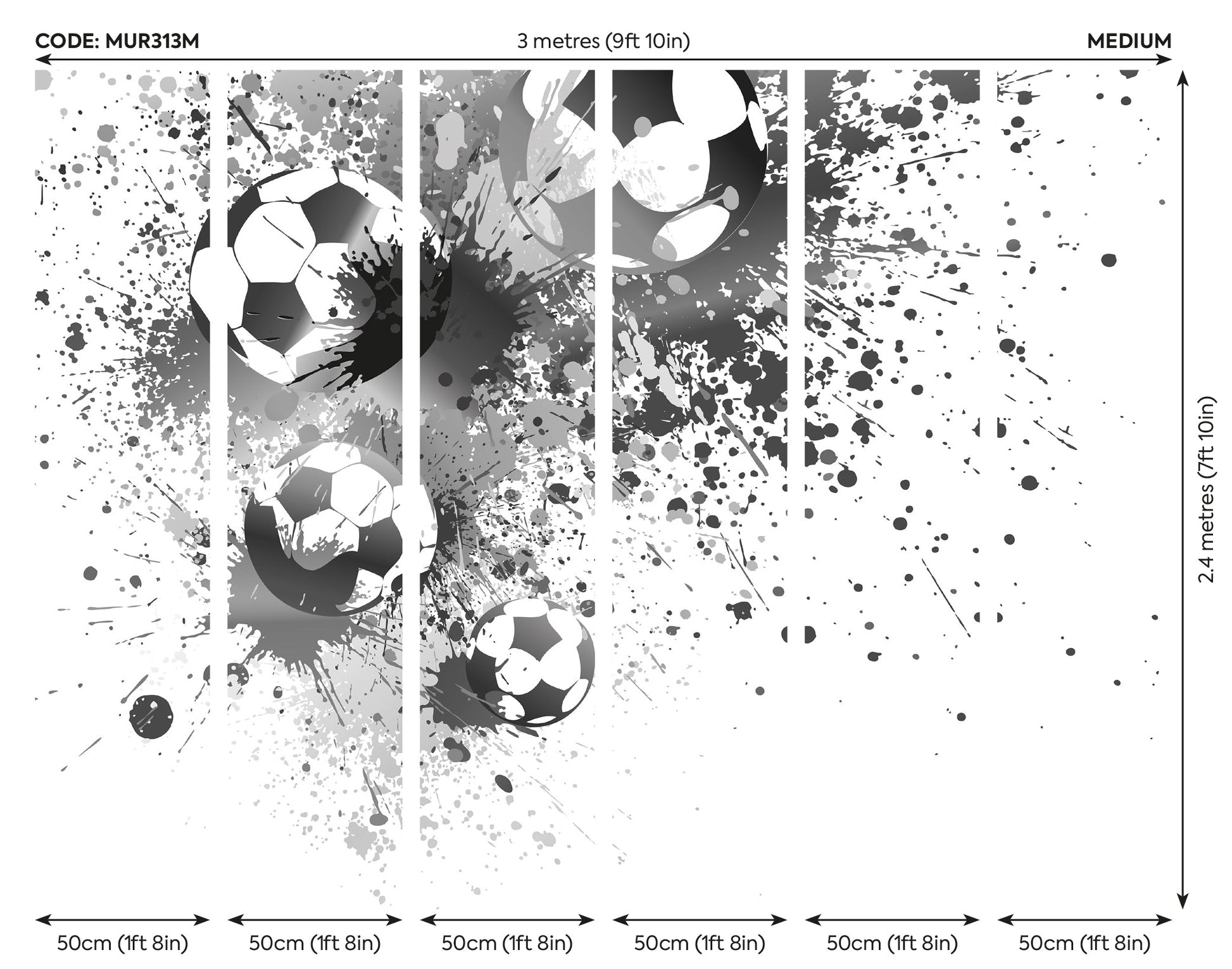 The Football Splash mural boasts an energetic collage, with bold brush strokes and splashes of grey accented by dynamic hints of football-inspired graphics. The design bursts with vibrant movement, evoking the high-spirited excitement of a football match, while the dramatic composition creates an unmistakable focal point in any room.