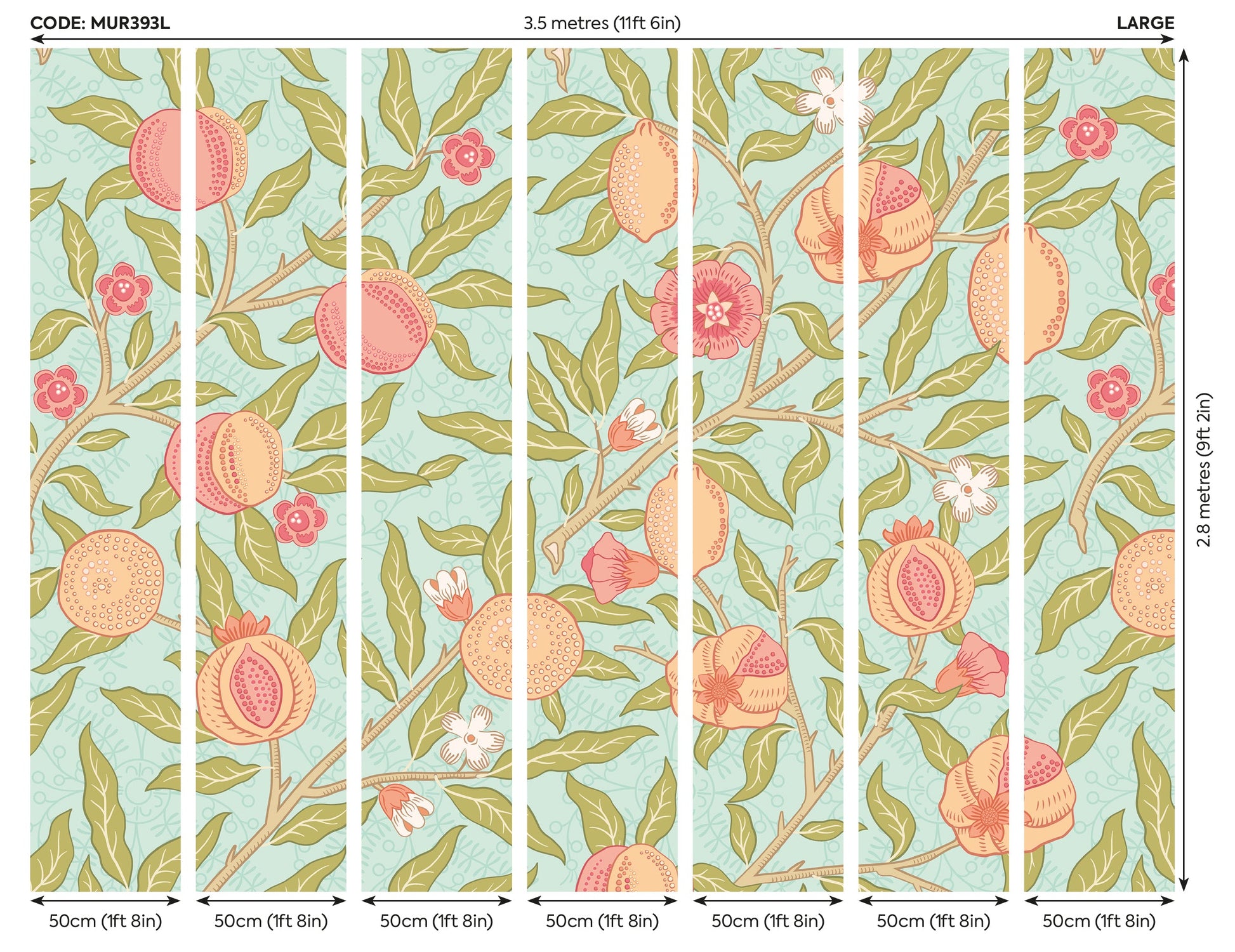 The mural image exudes vitality, with intricate diagonal branches stretching gracefully across the design. Stylised flowers and pomegranates are carefully interspersed, creating a lush, abundant landscape. The harmonious aqua and apricot palette lends an inviting, refreshing atmosphere, while the rich foliage and flora provide a captivating sense of depth and movement.