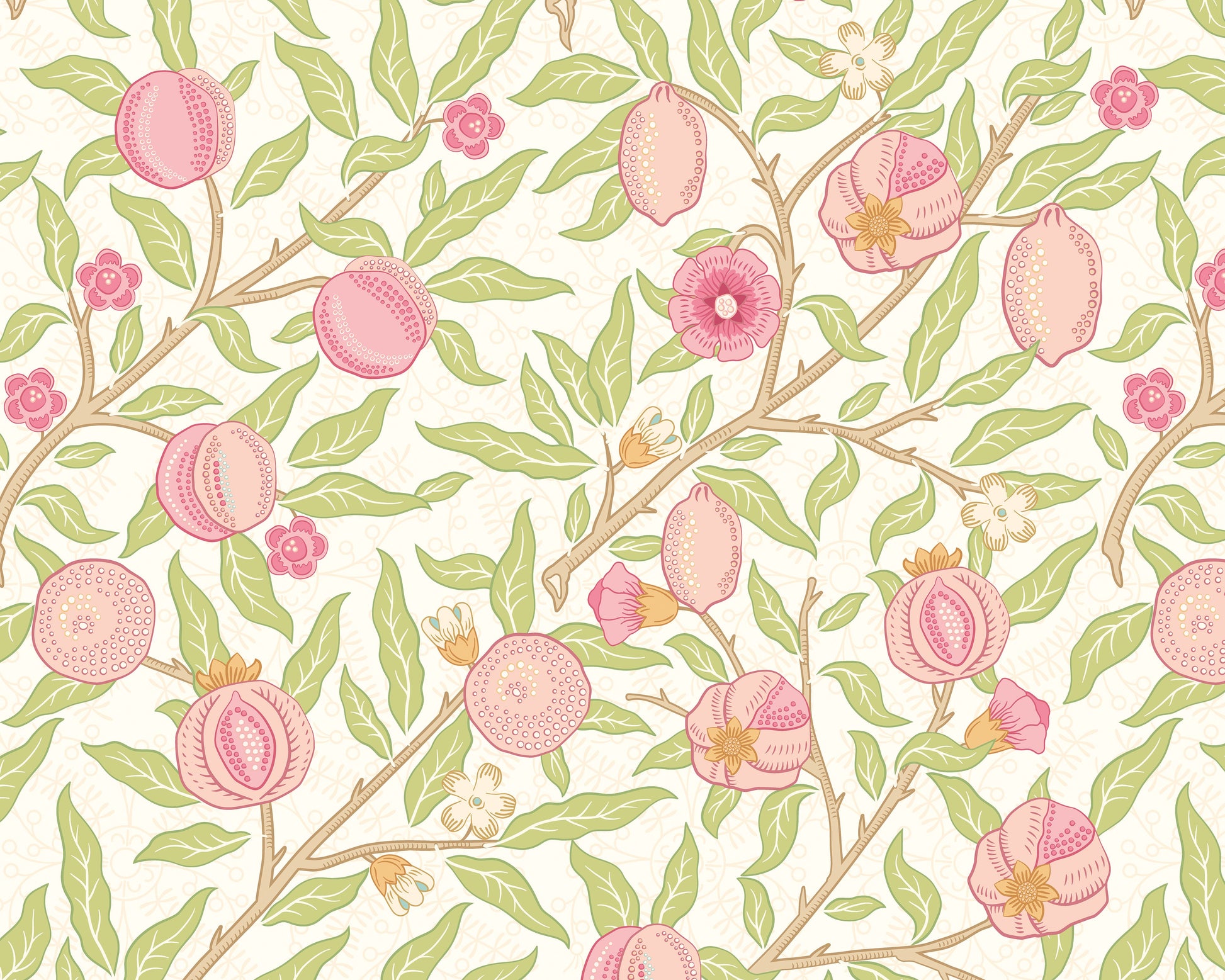 This wallpaper showcases a beautifully illustrated scene with elegant diagonal branches winding playfully across the mural. Delicately stylised flowers intermingle with ornate pomegranates, all set amidst a thriving tableau of lush greenery and enchanting fauna. The image radiates a sense of balance and calm, evoking the charm of a modern garden retreat in your home.