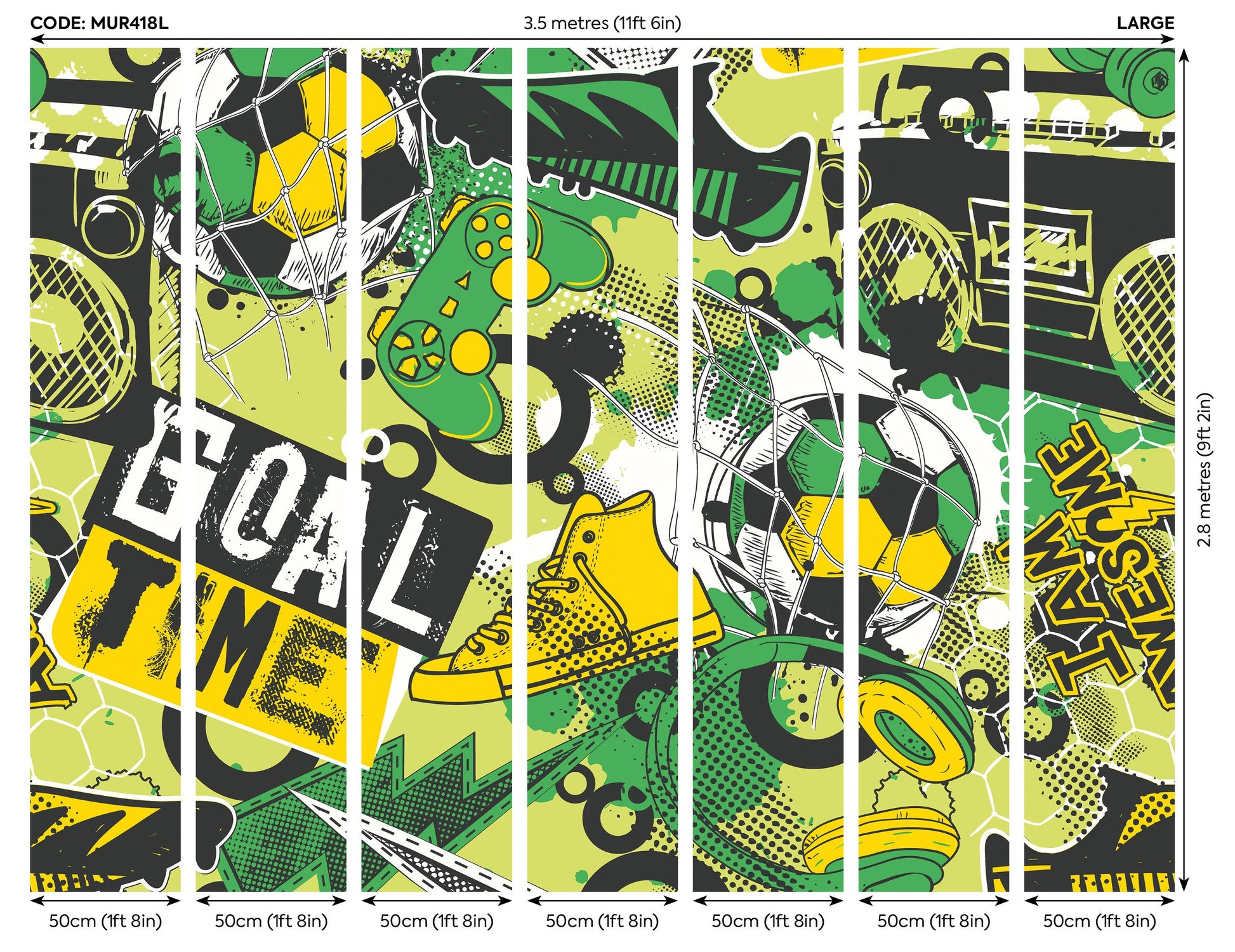 The Origin Murals Games Splash Green Mix mural is a splendid choice for transforming any child’s room into a vibrant, sporty haven. According to the brand's own description, this mural instantly injects walls with a burst of colour and a fun, athletic vibe. Its lively motif is ideal for children who love football, embrace all forms of movement, or simply dream of adventure during their playtime.