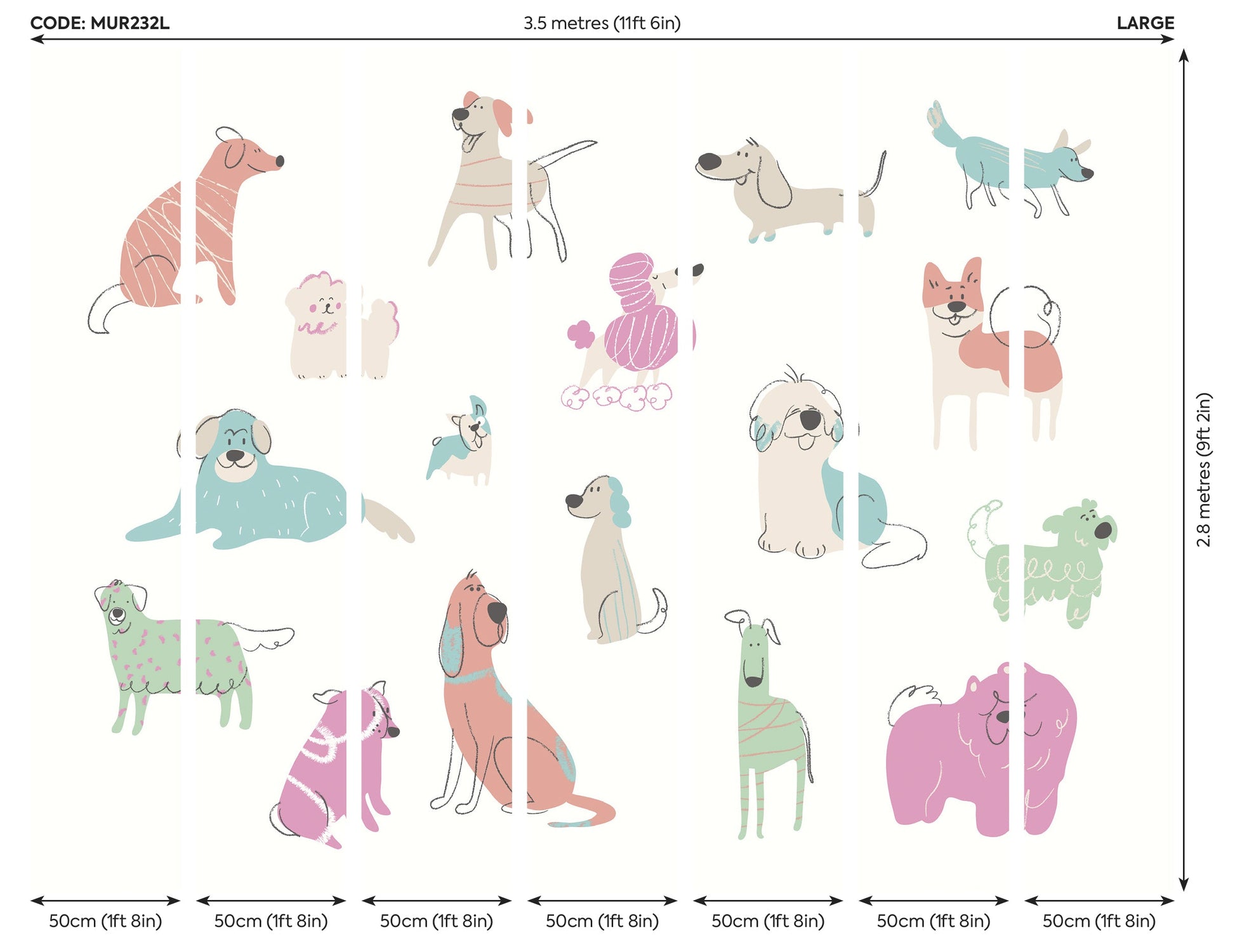 The image showcases a delightful array of cartoon-style, doodled dogs in various breeds, each drawn with joyful expressions and playful postures. Set against a soft blush pink background, the dogs appear full of life and character, bringing a cheerful and uplifting feel to your interior. The overall appearance is positive and heartwarming, with the mural radiating a sense of fun and energy.
