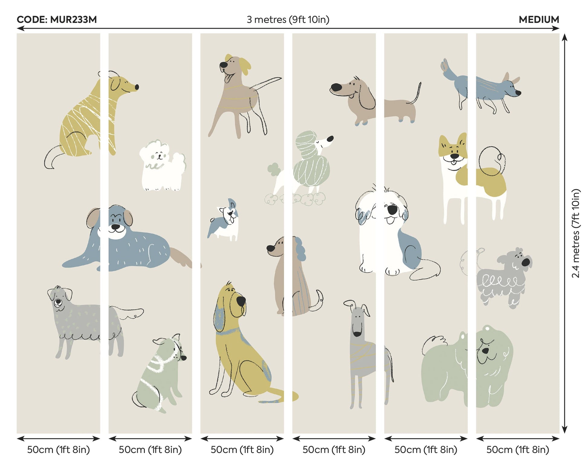 The image showcased on this mural brims with personality, depicting a delightful array of cheerful, doodled dogs set against a warm grey backdrop. The assortment of canine expressions and playful poses creates a delightful sense of movement and happiness, instantly lifting the mood of the space and inviting smiles from all who encounter it.
