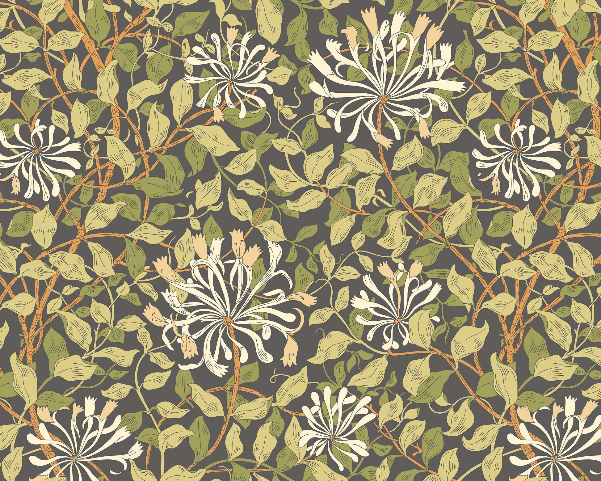 In this captivating mural, graceful honeysuckle vines meander elegantly across a dramatic black and olive green backdrop. The meticulous illustration invites the eye to trace intertwining stems and delicate leaves, dancing with lifelike movement against the wall. The overall impression evokes a sense of botanical luxuriance within the home, transforming any room into an elegant sanctuary inspired by nature.