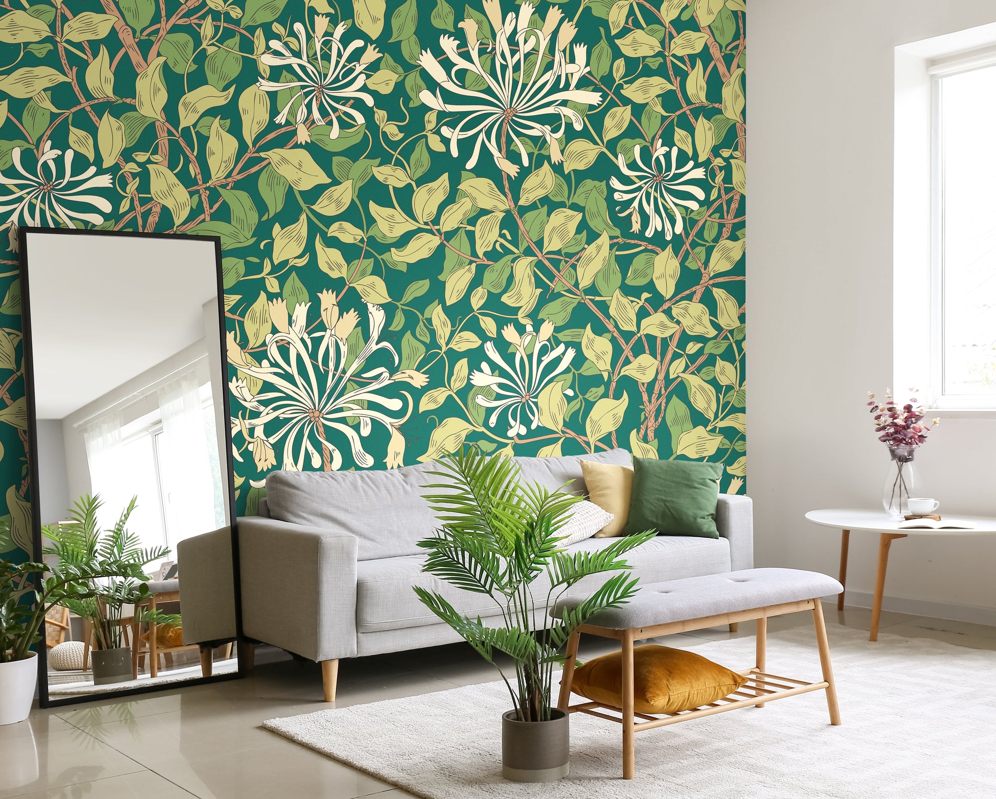 The visual composition features intricate honeysuckle vines that gracefully entwine with rich foliage, creating a lifelike tapestry that appears to grow organically across the wall. The palette is a deep, enchanting green that adds a natural yet luxurious ambience, while the detailed illustration recalls the timeless work of May Morris. Each element delicately merges classic motifs with a contemporary vision, making it perfectly suited for those seeking both tradition and elegance in their décor.