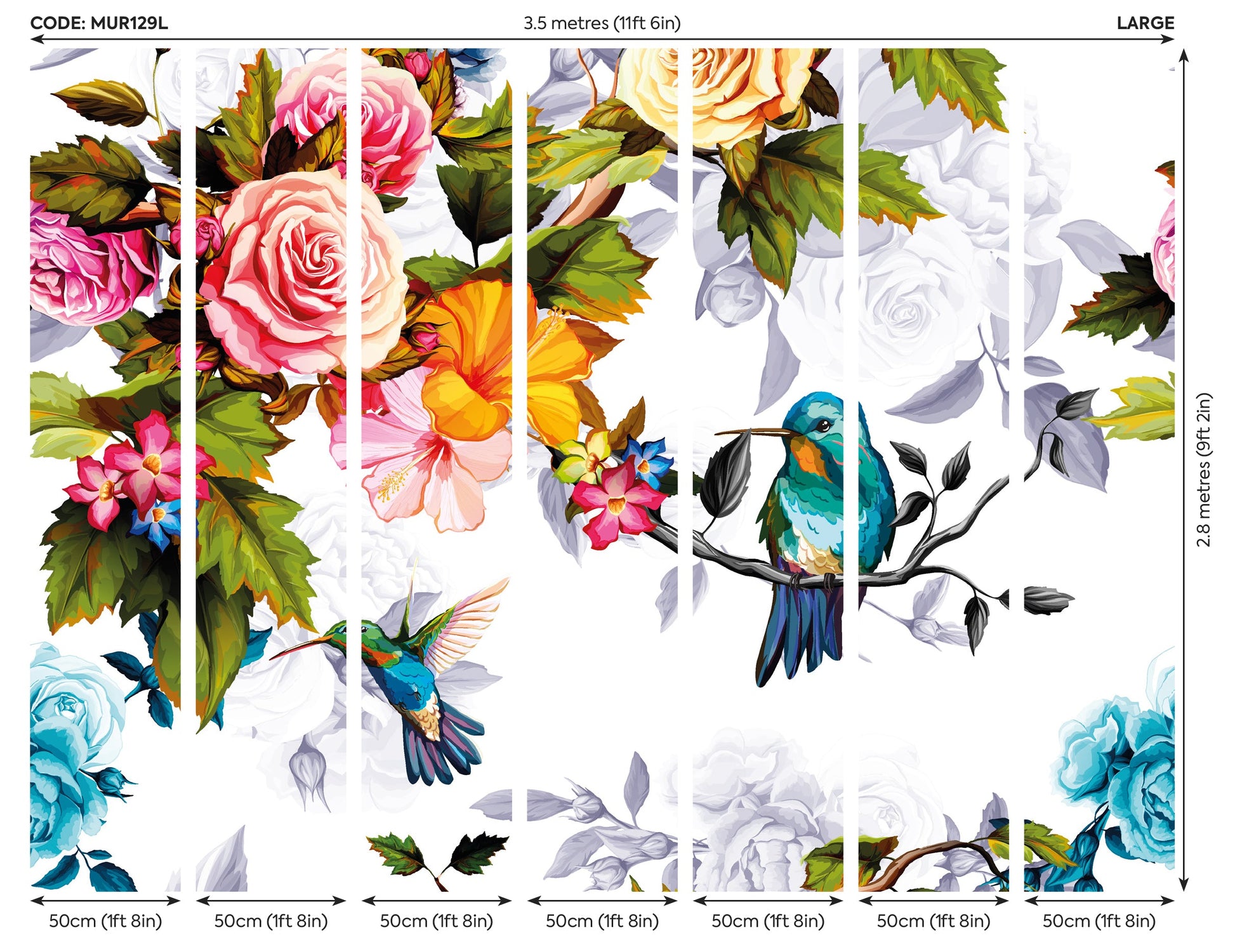 - Features delicate hummingbirds and a vibrant array of floral blooms
