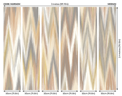 The mural features a stunning interplay of blended, multi-hued lines arranged in a large-scale Ikat zig zag pattern. Softly blurred contours and harmonious colours blend together seamlessly, bringing a gentle twist to classic geometric design. The carefully rendered zig zag motif echoes the look of hand-woven textiles, creating a mural that is not only visually striking but also inviting and versatile.