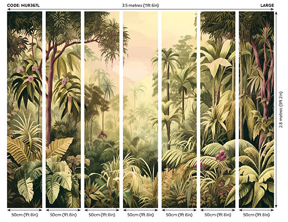 The visual narrative displays a captivating jungle scene filled with lush, dense foliage and tall palm trees in striking olive green hues. In the background, the mural features faded palm silhouettes and distant mountains, creating a breathtaking sense of depth and tranquillity within your chosen space. This beautifully detailed design captures the ambience of a tropical paradise, instantly transforming your room into an inviting sanctuary.