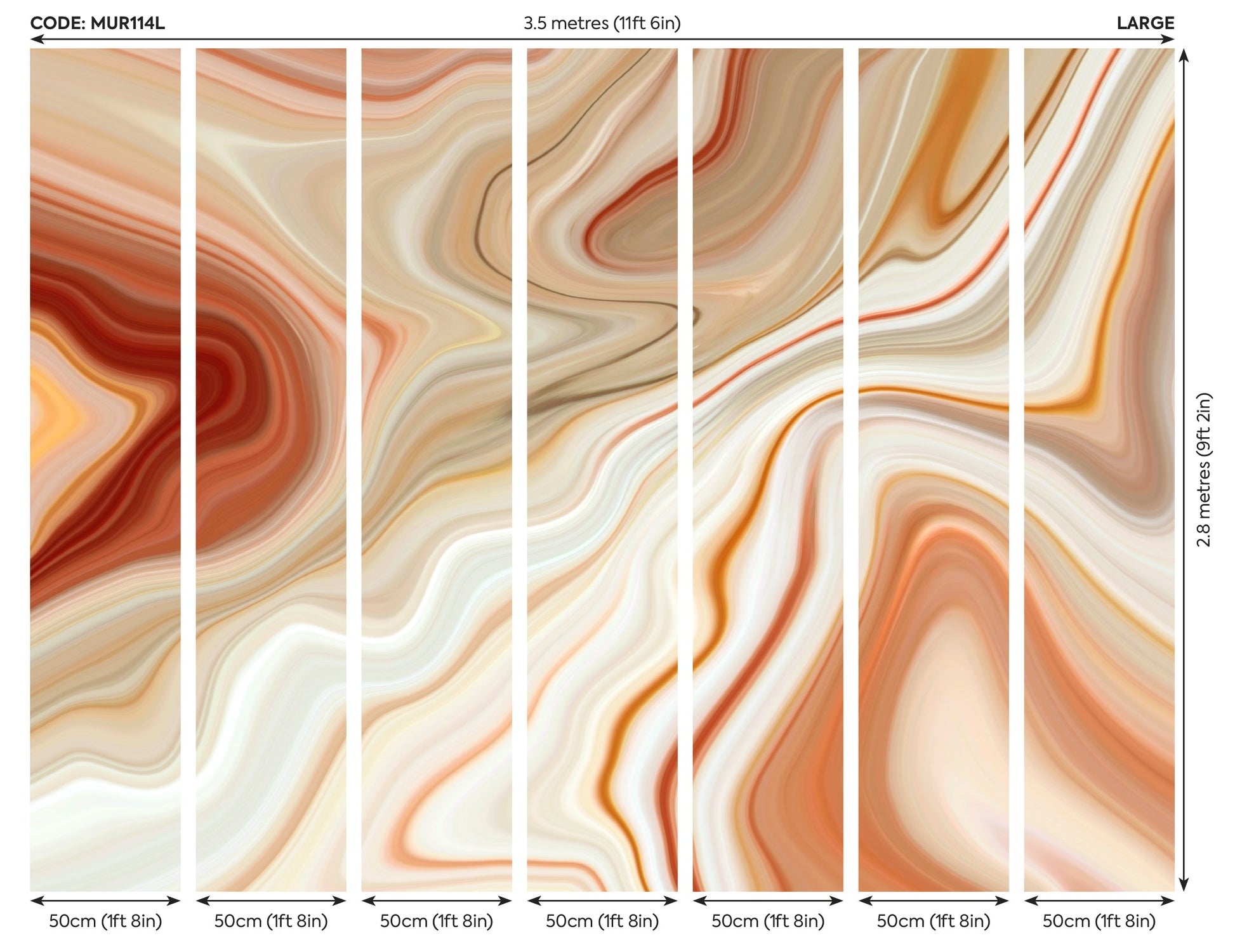 In the image, a mesmerising expanse of richly blended, cinnamon-hued inks sweeps across the mural, displaying delicate ribbons of colour intertwined in a harmonious dance. The abstract swirls evoke a soothing sense of organic movement, resembling an artist’s careful brushstrokes or the natural flow of marbled stone, resulting in a tranquil yet dramatic backdrop for any interior.