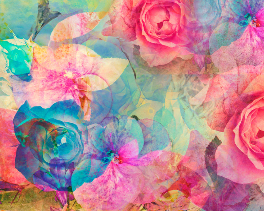 The main image reveals a captivating mural featuring bold, layered roses and softly blurred petals. The double exposure effect fuses petals and blooms, which appear to melt seamlessly into one another. Warm, vibrant colours dance across the scene, evoking a spirited yet refined atmosphere. The composition is visually intriguing, drawing the viewer in and creating an immersive, gallery-inspired backdrop for any room.