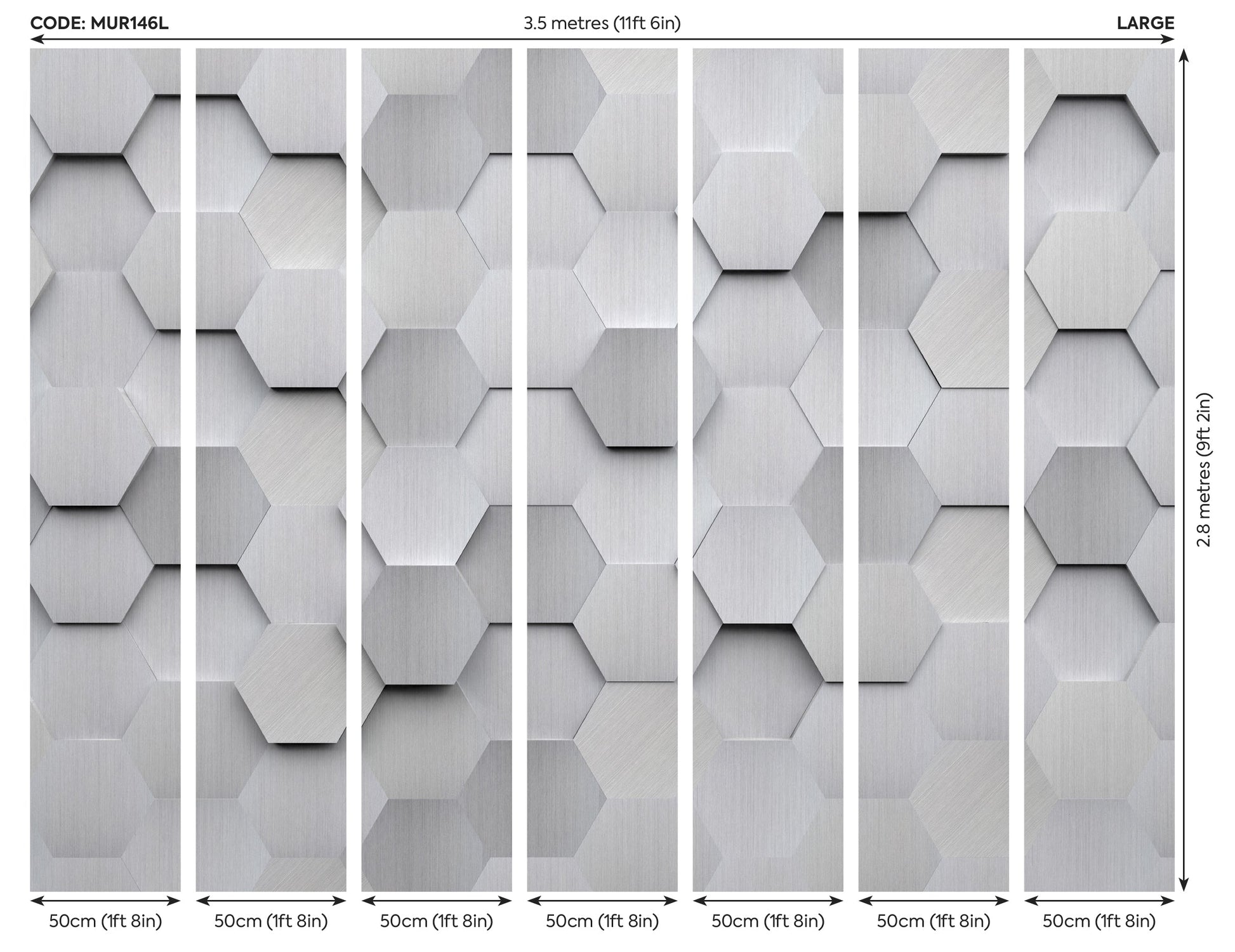 The Origin Murals Metal Hexagons Silver 350cm X 280cm is designed to catch the eye, as the repeated geometric shapes establish a graceful sense of flow across the entire surface. This piece uniquely balances modernity with timeless appeal, making it a captivating focal point for any interior.