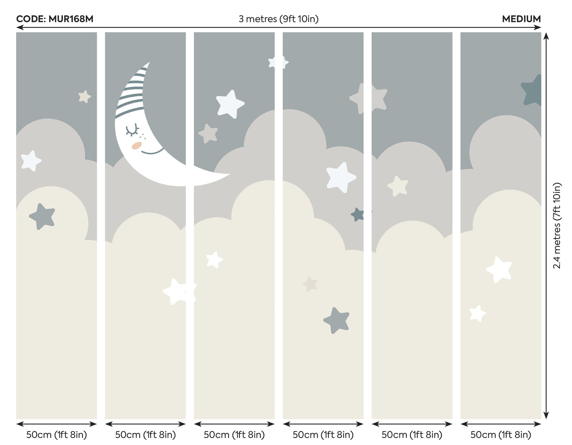 The Origin Murals Nighttime Childrens Sky Dove Grey mural wallpaper offers a simple yet charming design, with elements that evoke a sense of serenity and calmness. The mural’s celestial theme transforms the walls into a dreamland, providing a comforting and imaginative space for restful sleep or creative play. This product is specifically crafted to nurture a feeling of safety and wonder, aligning beautifully with the needs of a child's space.