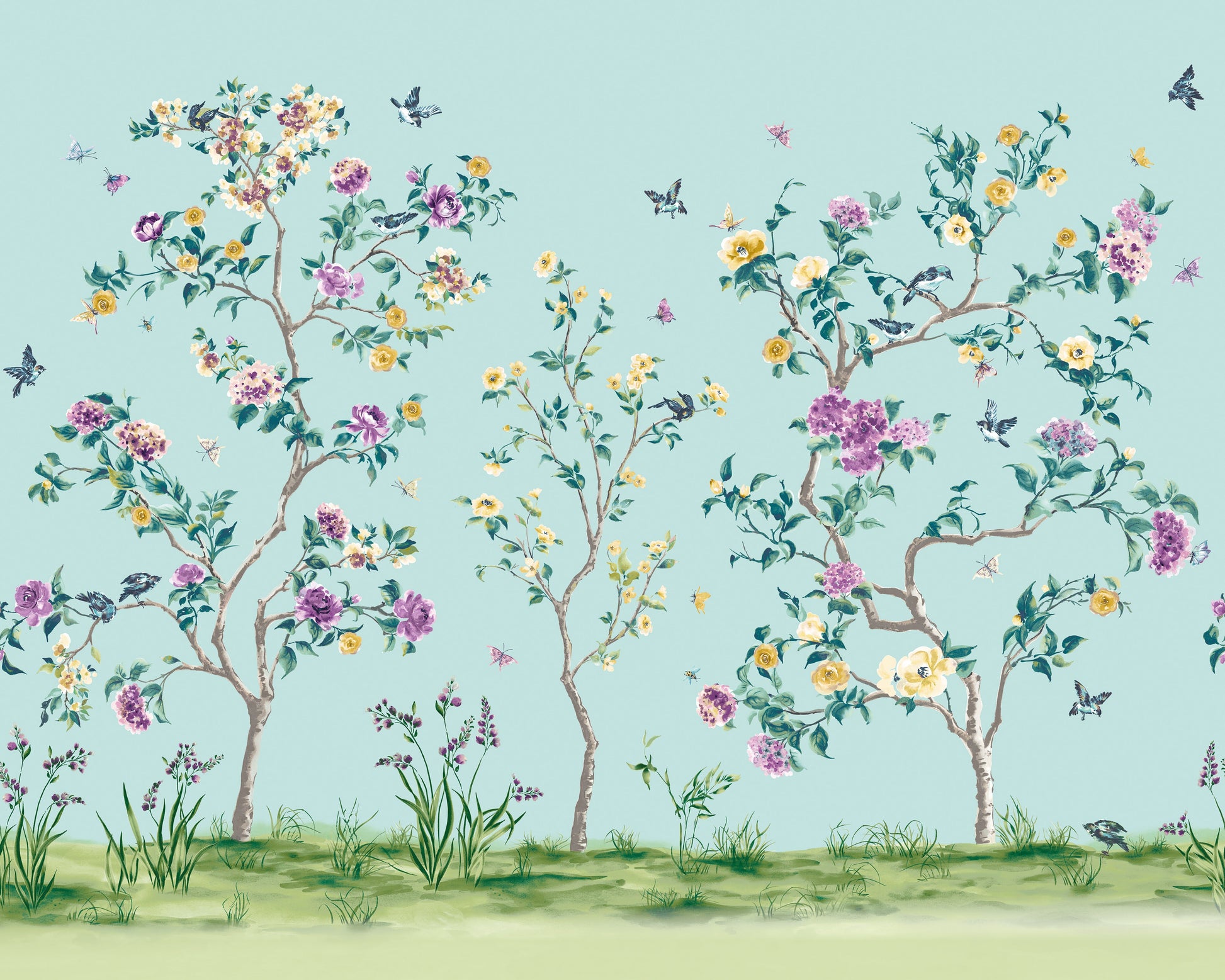 The image presented on the mural displays a mesmerising, hand-drawn chinoiserie scene: delicate watercolour flowers and elegant trees bloom across a rolling landscape, while birds and butterflies drift gracefully throughout. Rich, blue tones blend harmoniously with soft greens and subtle accents, conjuring a peaceful, botanical garden ambience that soothes the senses and enlivens any space.