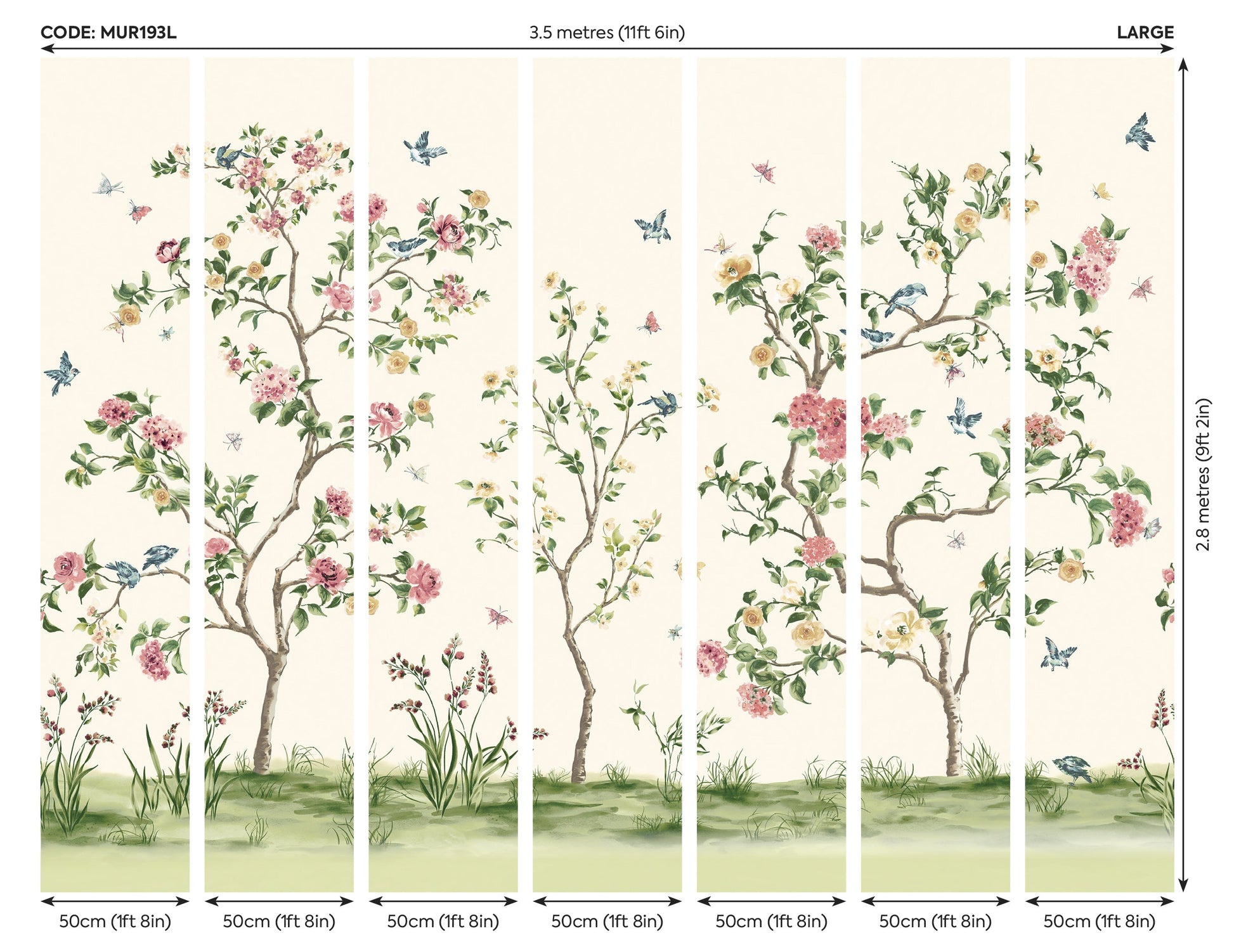 - Rich watercolour depiction of flowers, trees, birds, and butterflies breathing life into your walls
