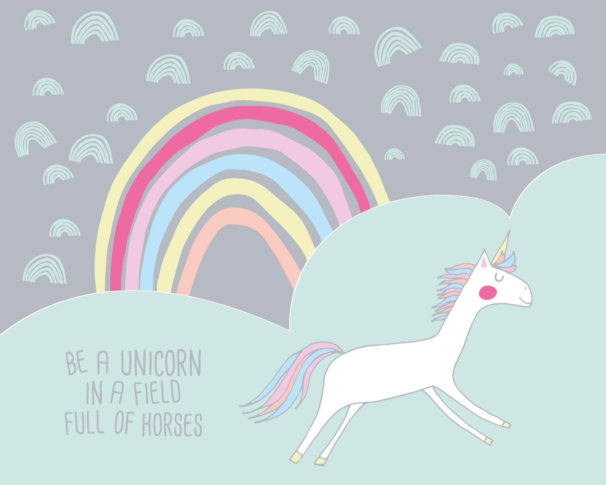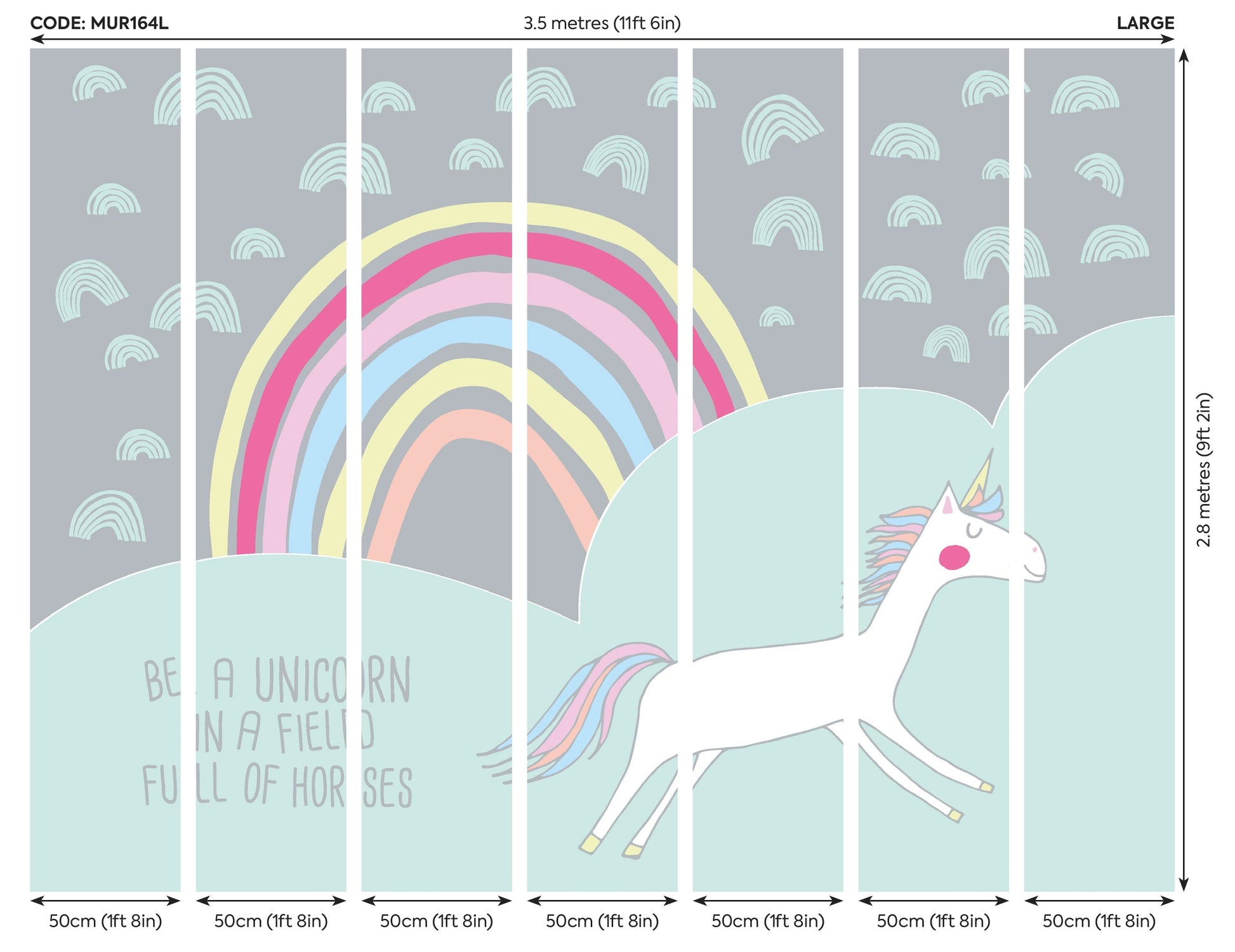 The Origin Murals Rainbow Unicorn Mint Grey 350cm X 280cm wallpaper showcases a delightful hand-drawn illustration. At the centre, a whimsical unicorn doodle takes pride of place, encircled by playful rainbow motifs that add a sense of fun and charm. The scene is set against a tranquil palette of soft mints and greys, creating a soothing and serene atmosphere in the room. The gentle pastels lend the mural an enchanting yet calming appeal, suitable for bedrooms, nurseries, or creative spaces.