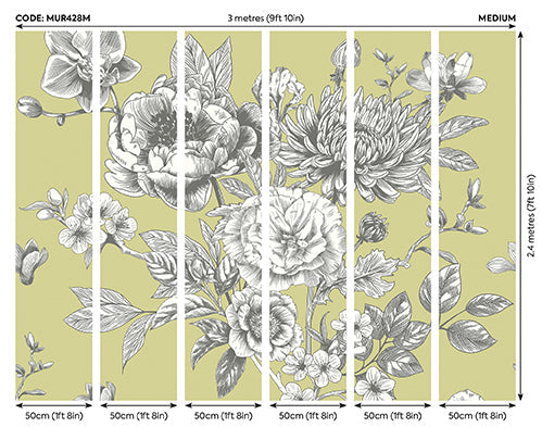 The mural presents an enchanting scene, beautifully illustrated with plentiful, oversized roses and delicate botanical detailing. The apple green backdrop perfectly offsets the traditional floral imagery, lending a fresh yet timeless quality to any room. The intricate patterns evoke the romance of classic wallpaper designs, creating the ideal focal point for both contemporary and traditional homes.