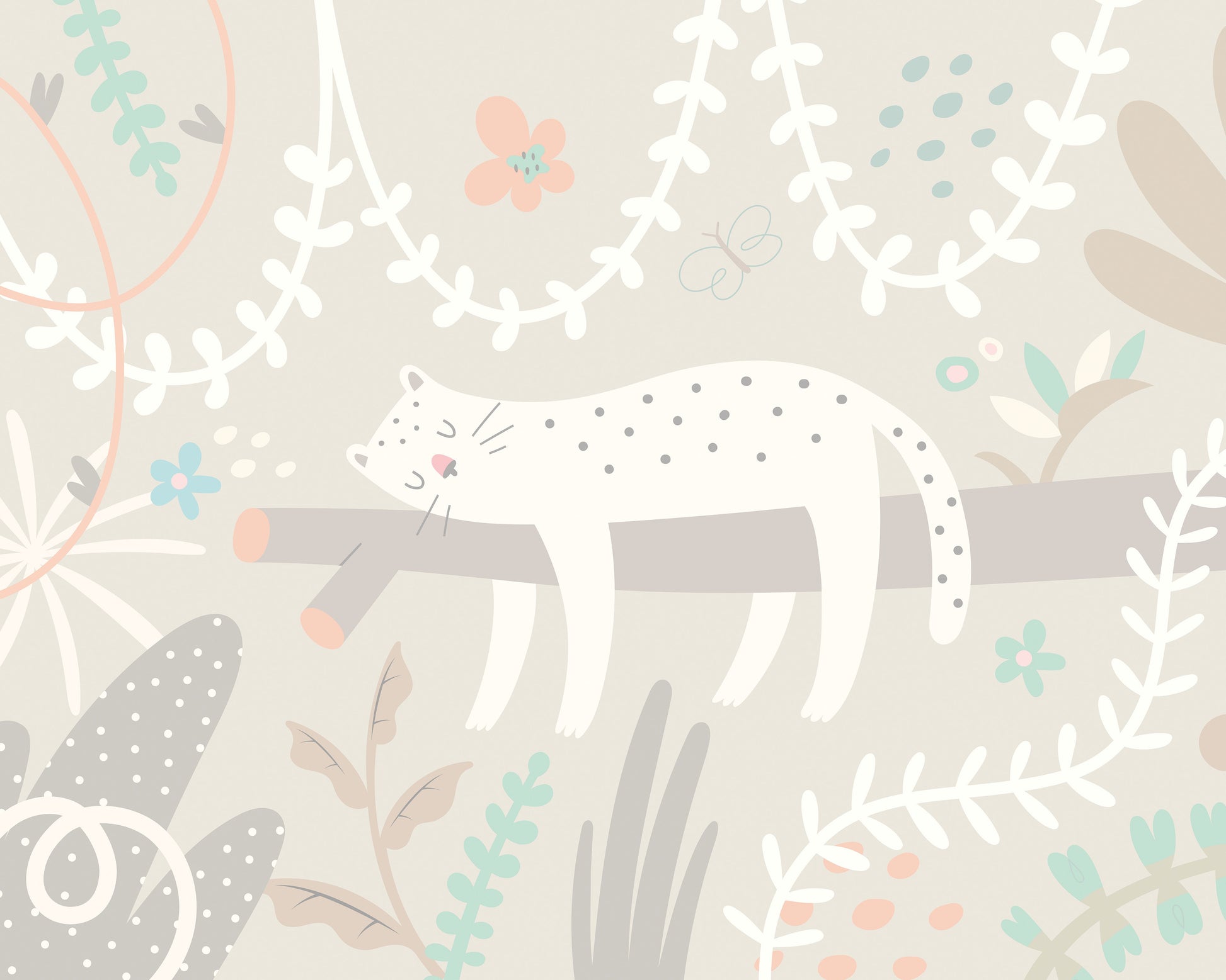 The wall mural presents a captivating scene: a tranquil leopard, eyes closed in restful slumber, lies gracefully amid a lush jungle backdrop. Vines gently entwine around flowering branches, while delicately illustrated leaves create a sense of depth. Subtle decorative dots and softly fluttering butterflies lend a feeling of enchantment, crafting a peaceful and inviting atmosphere, perfect for a child's room.