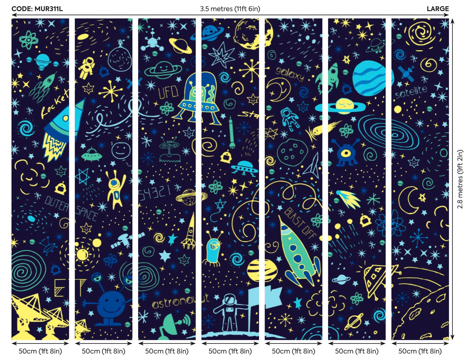 The Origin Murals Space Doodle Text Navy Blue 350cm X 280cm wallpaper from Origin Murals brings intergalactic inspiration into any room. Designed to captivate, this striking wallpaper sparks creativity while uplifting your interiors. It is ideal for children’s bedrooms, playrooms, or anyone with a fondness for the cosmos and contemporary décor.