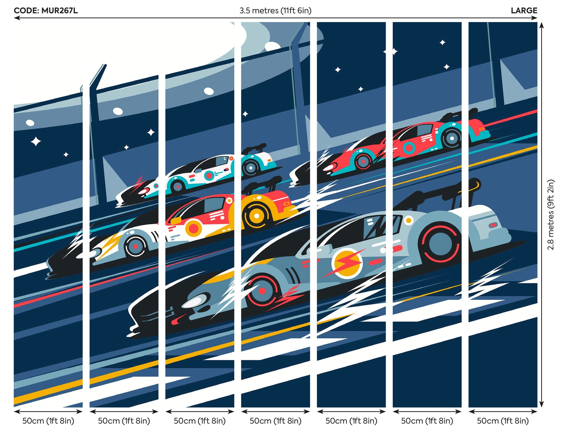 The image featured on this wallpaper is vibrant and lively: sportscars in an array of bright colours are depicted zipping around a race track, all set against a navy blue night sky illuminated by twinkling stars. The composition cleverly captures a sense of excitement and velocity, emphasised by dynamic zigzag symbols that accentuate the movement of the cars along their racing path. It’s a visually striking scene that effortlessly draws the eye and brings a joyful energy to the room.