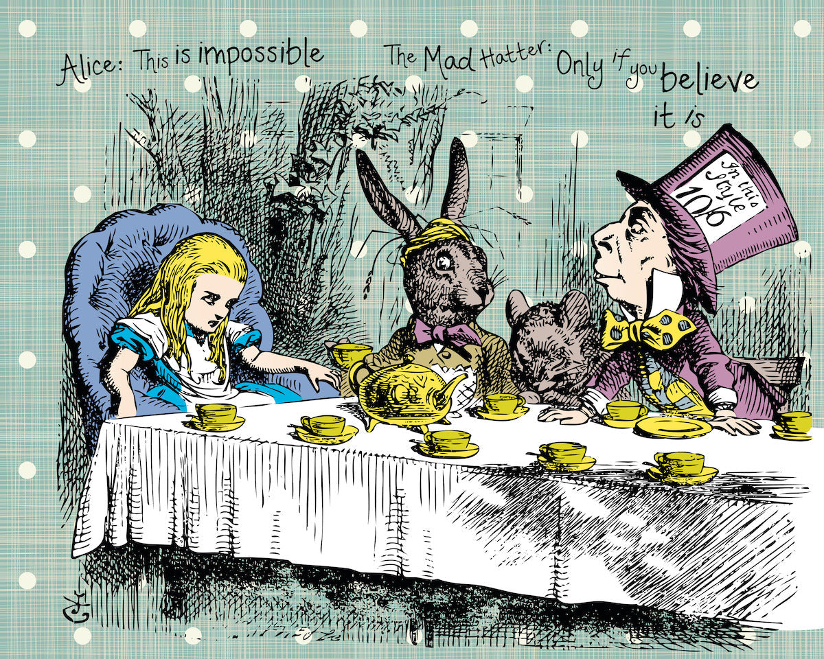This eye-catching wallpaper features a charming scene capturing the whimsy of an enchanting tea party. The design showcases fantastical characters gathered around an elaborate table set amidst a dreamlike garden, inspired by John Tenniel’s beloved illustrations. Soft sage tones and intricate line work bring both nostalgia and an air of sophistication to your décor.