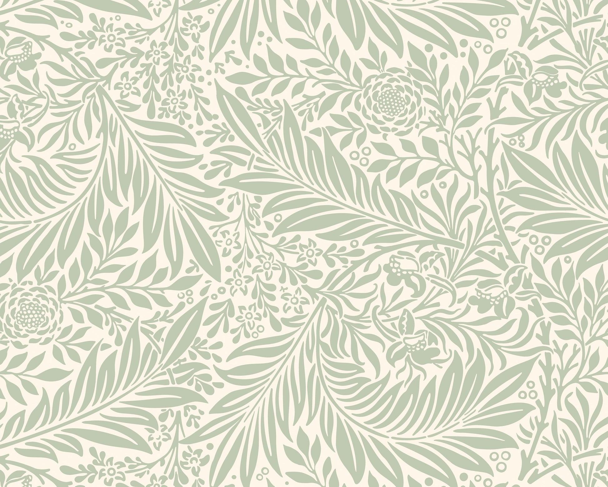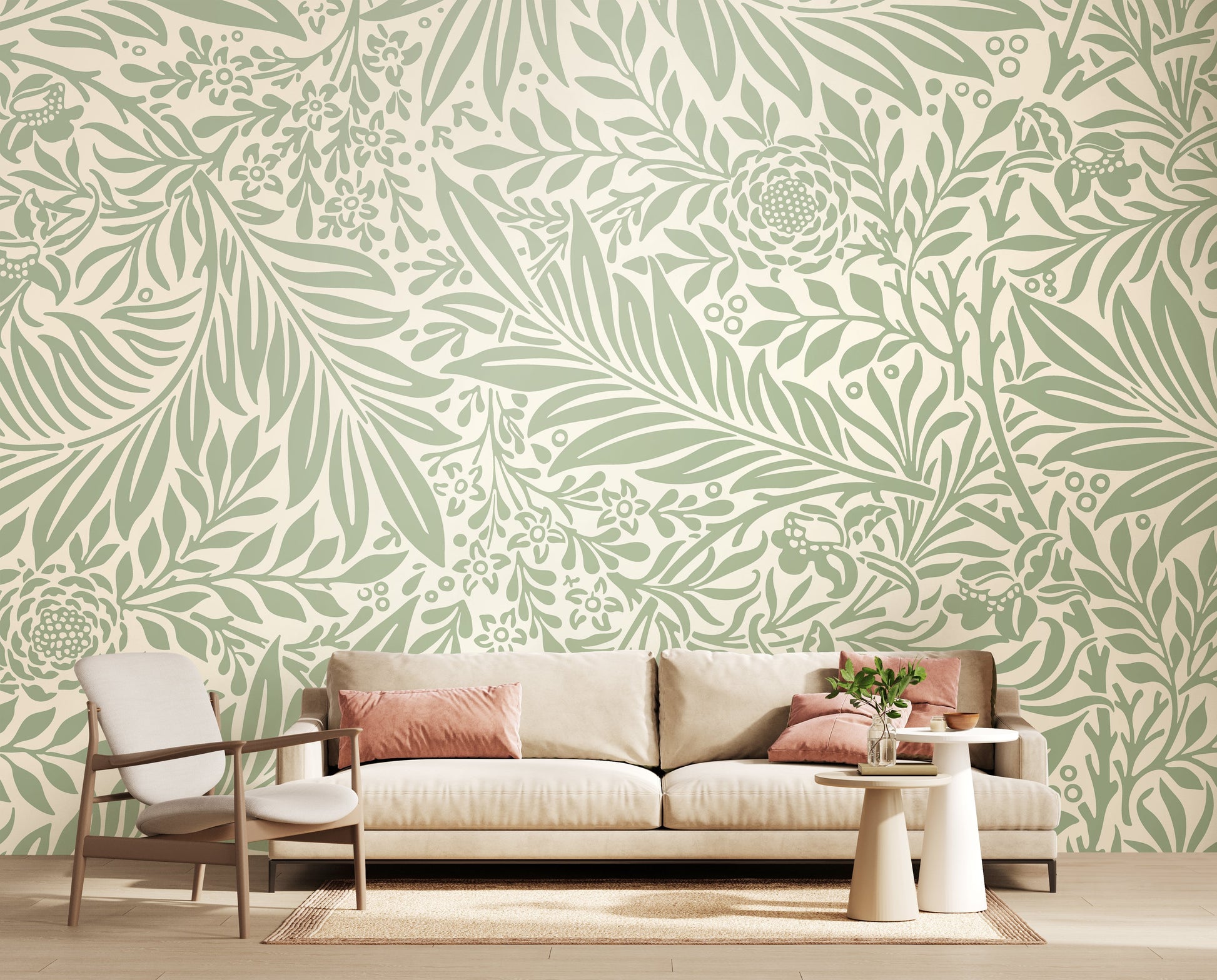The design features a serene motif with delicate flowers, graceful floating leaves, and finely detailed ferns, set against a calming sage green background. Small dots are subtly interspersed throughout, lending a gentle depth and understated character. The overall appearance is soothing and perfect for creating a tranquil atmosphere in any room.